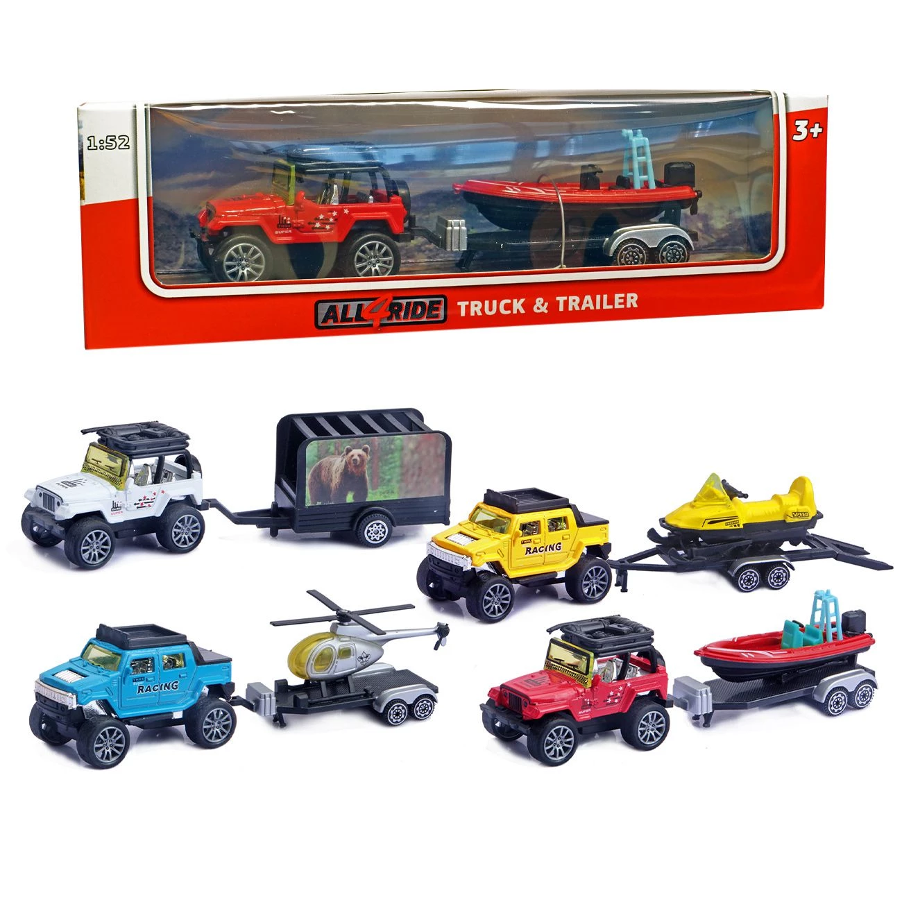 Avto - džip z vlečno prikolico. Džip 4 raličnih barv, kjer na vlečni prikolici prevaža različna vozila. Primerno za otroke od 3 let dalje.