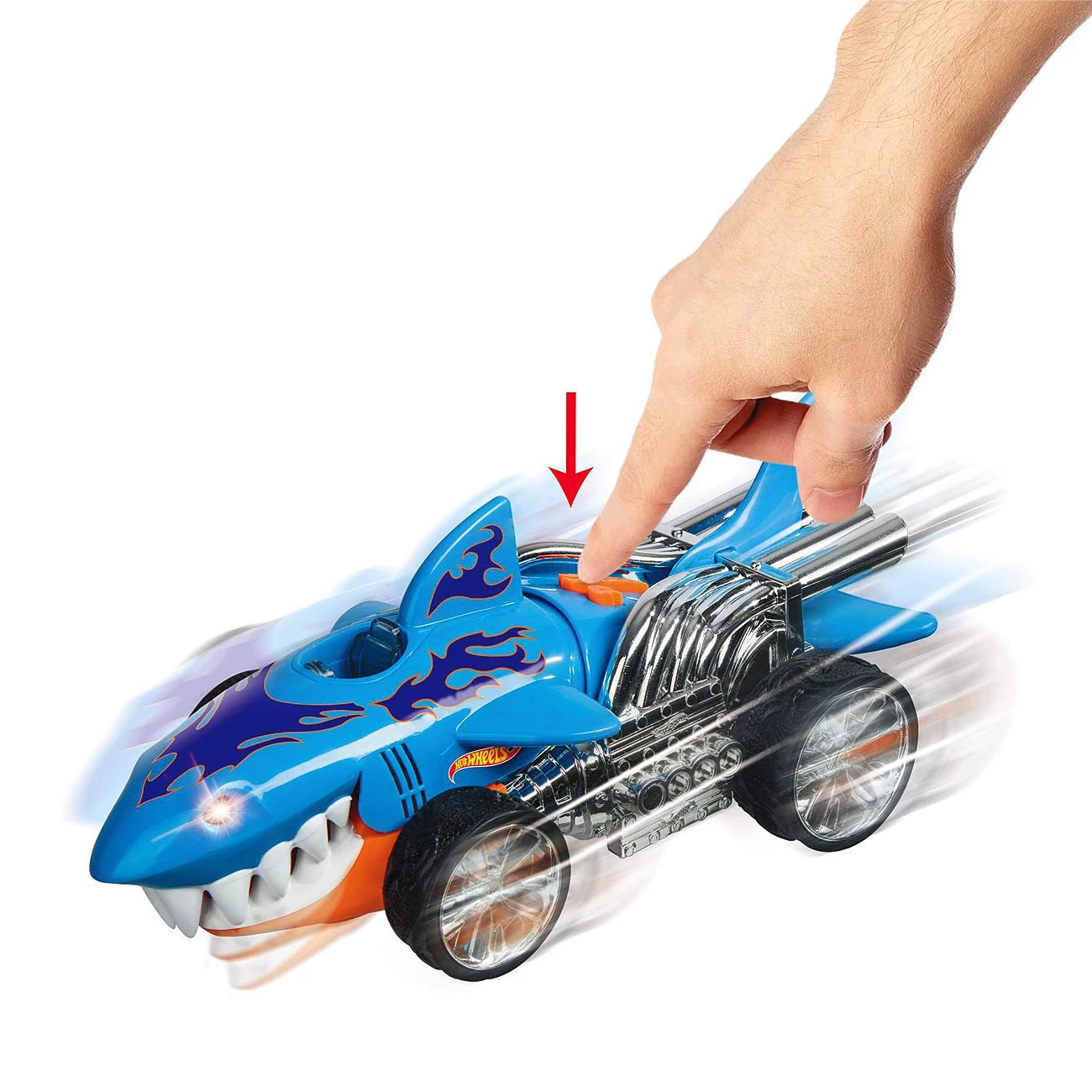 Atraktivni avto Hot Wheels Morski pes velikosti 21x11x10 cm. Vozilo ima različne zvočne in vizualne efekte. Ob pritisku na gumb se začne voziti v različne strani in kot morski pes odpira in zapira svoja usta. Za delovamje so potrebne 3 x AAA baterije, ki so priložene. Primerno za otroke od 3 let dalje.