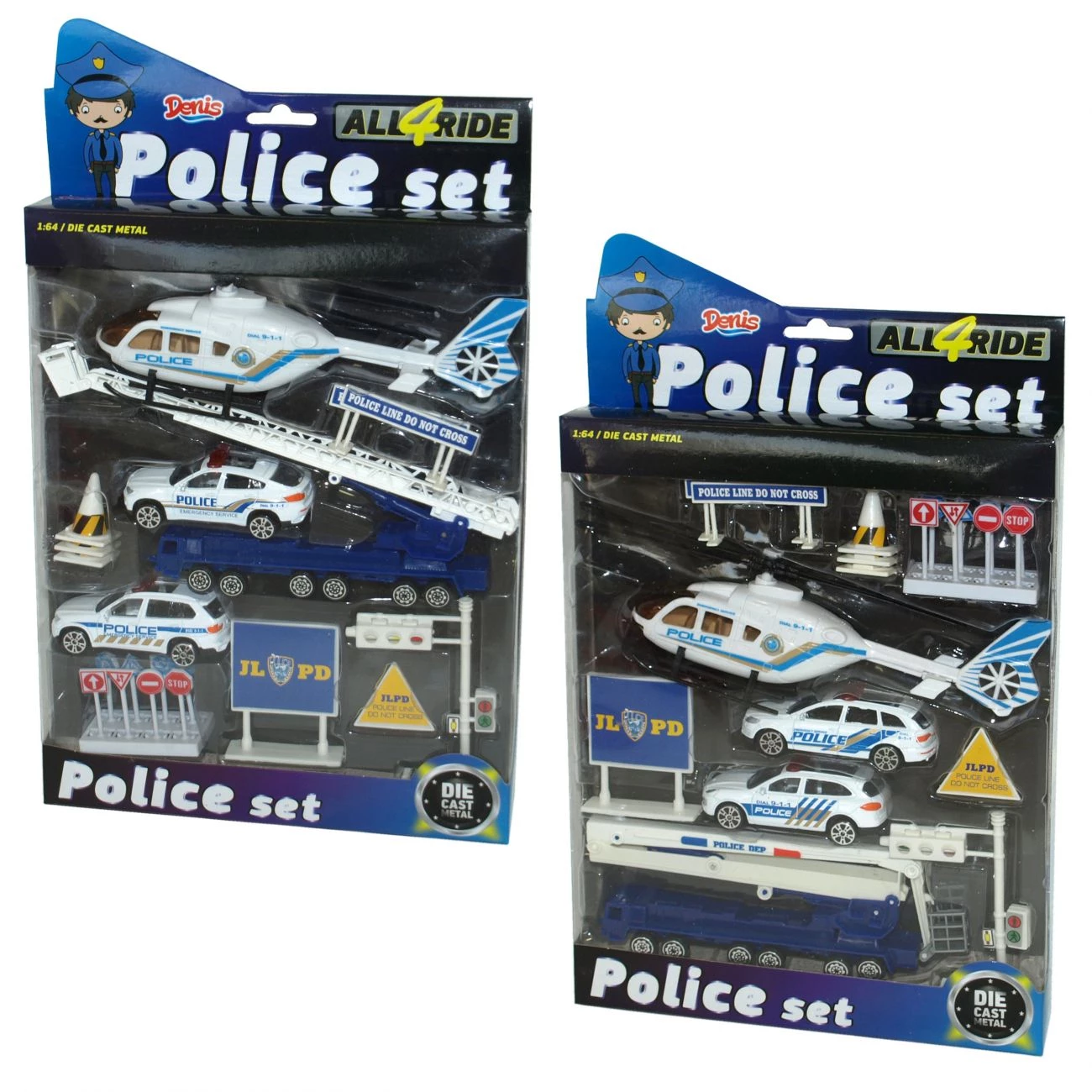 Set policijskih vozil. Vsebina: helikopter 7x18x3,5 cm, kamion 5x17x3 cm, 2 avta 3x8x3,5 cm, 15 kosov različnih prometnih znakov in signalizacije. Izdelano iz plastike in kovine. Gibljivi deli helikopterja in kamiona. Primerno za otroke stare 3 leta in več.