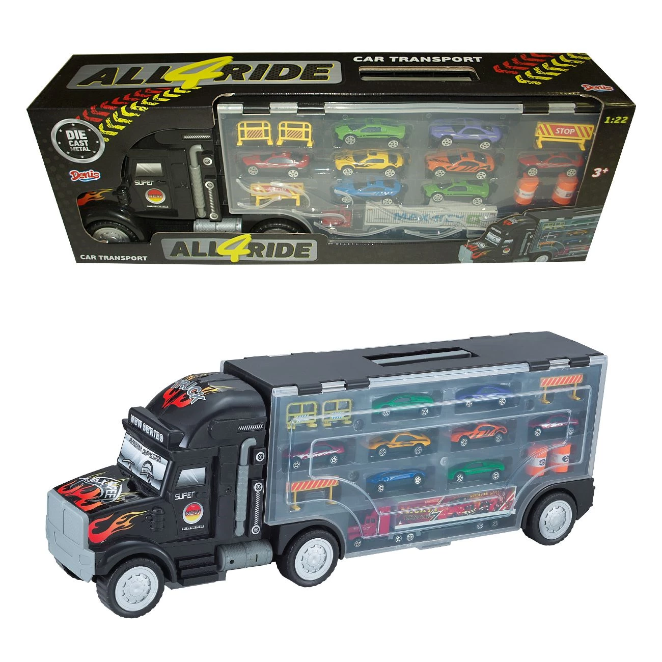 Kamion 20 x 57 x 11 cm. Vsebina: 8 avtomobilčkov 2 x 7 x 3 cm, kamion 4,5 x 19,5 x 2,5 cm, (izdelano iz kovine in plastike), 6 prometnih znakov. V prikolici je mesto za pospravljanje 24 avtomobilčkov in 2 kamiona.