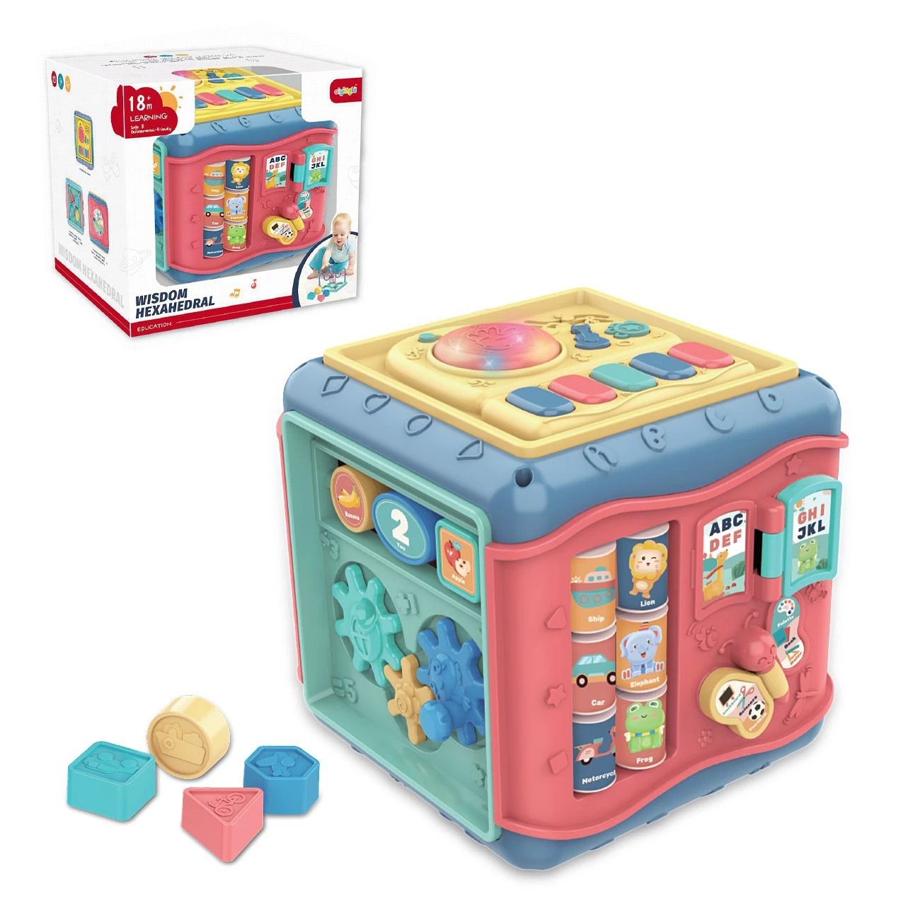 Didaktična glasbena kocka z zvokom in glasbo pomaga pri razvoju otrokovih motoričnih sposobnosti in razmišljanju. Didatktična večbarvna kocka omogoča otroku, da razvije čut in ljubezen do glasbe, z igranjem in pritiskanjem na tipke razvija motoriko, ter spoznava različne oblike. Za delovanje so potrebne 3 x AA baterije, ki niso priložene. Primerno za otroke od 18 mesecev dalje.