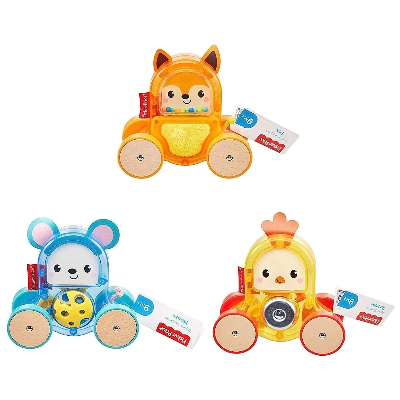 Fisher Prise živali na kolesih so odlična zabava za najmlajše.Namenjena za sedečo igro in plazenje. Vsak avtomobilček ima drugačno aktivnost, petelin zvoni na zvonec, miš kotali sir na svojem trebuščku, lisica ima kroglice, ki ropotajo. Primerno za otroke od 9 mesecev dalje.
