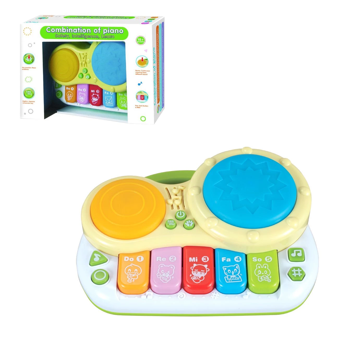 Glasbeni elektonski klavir z bobni. Z svetlobnimi in zvočnimi efekti. Otrok spoznava različne melodije. Potrebujete baterije 2xAA, ki nso priložene.