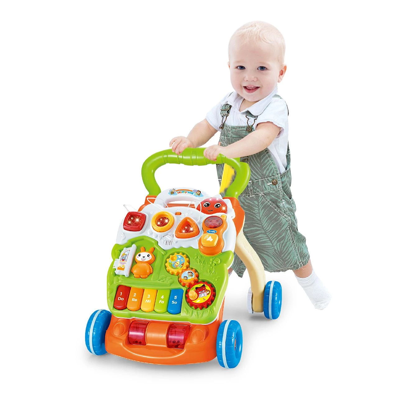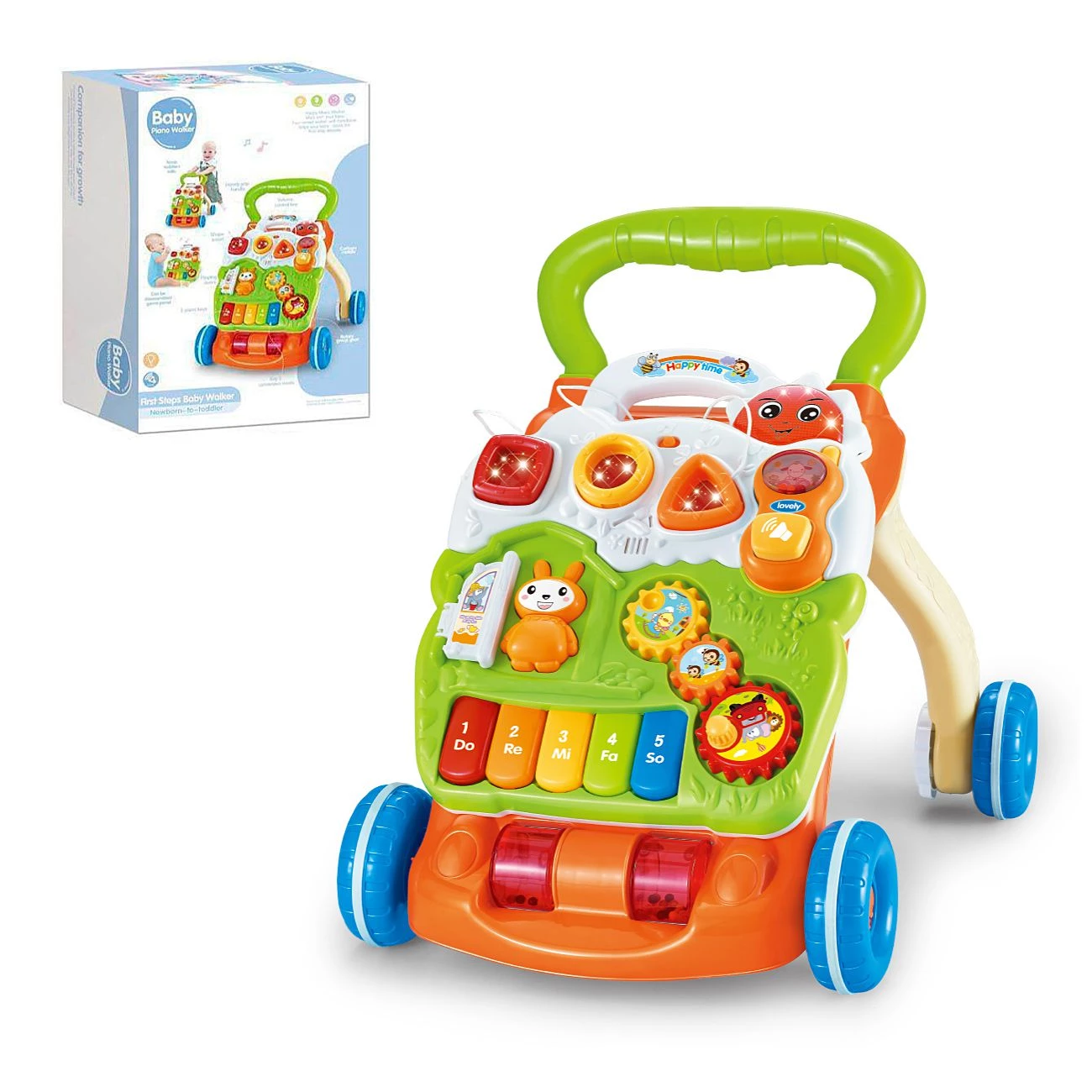 Otroški sprehajalec pomaga pri otroku pri osvajanju njegovih prvih varnih korakov. Sprehajalec je hkrati zabavna igra, saj se lahko otrok igra z zvočno igralno ploščo, na kateri je klavir, mobitel in razne ropotulje. Za delovanje so potrebne 3xAA baterije, ki niso priložene. Velikost: 32 x 18 x 47 cm. Primerno za otroke od 12 mesecev dalje.
