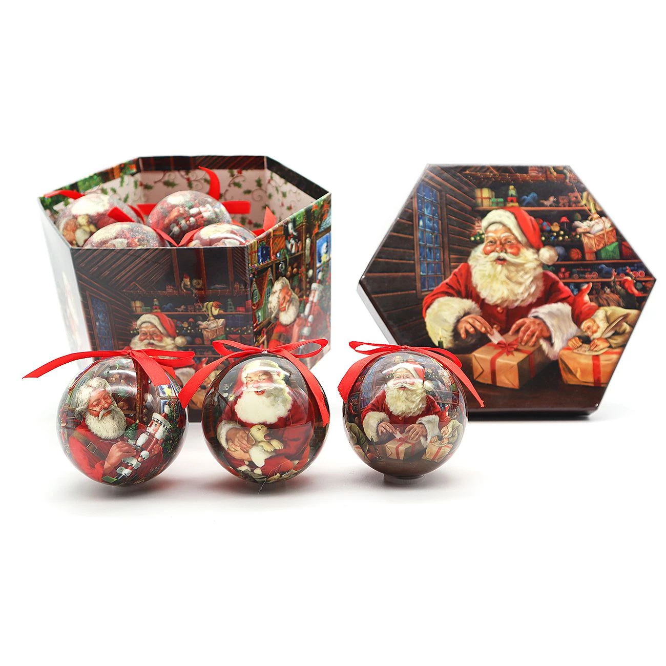 Komplet 14 kroglic v lepi dekorativni darilni škatli z motivom Božička. Premer kroglic 7,5cm, 7 sijaj in 7 matiranih kroglic z motivom Božička.