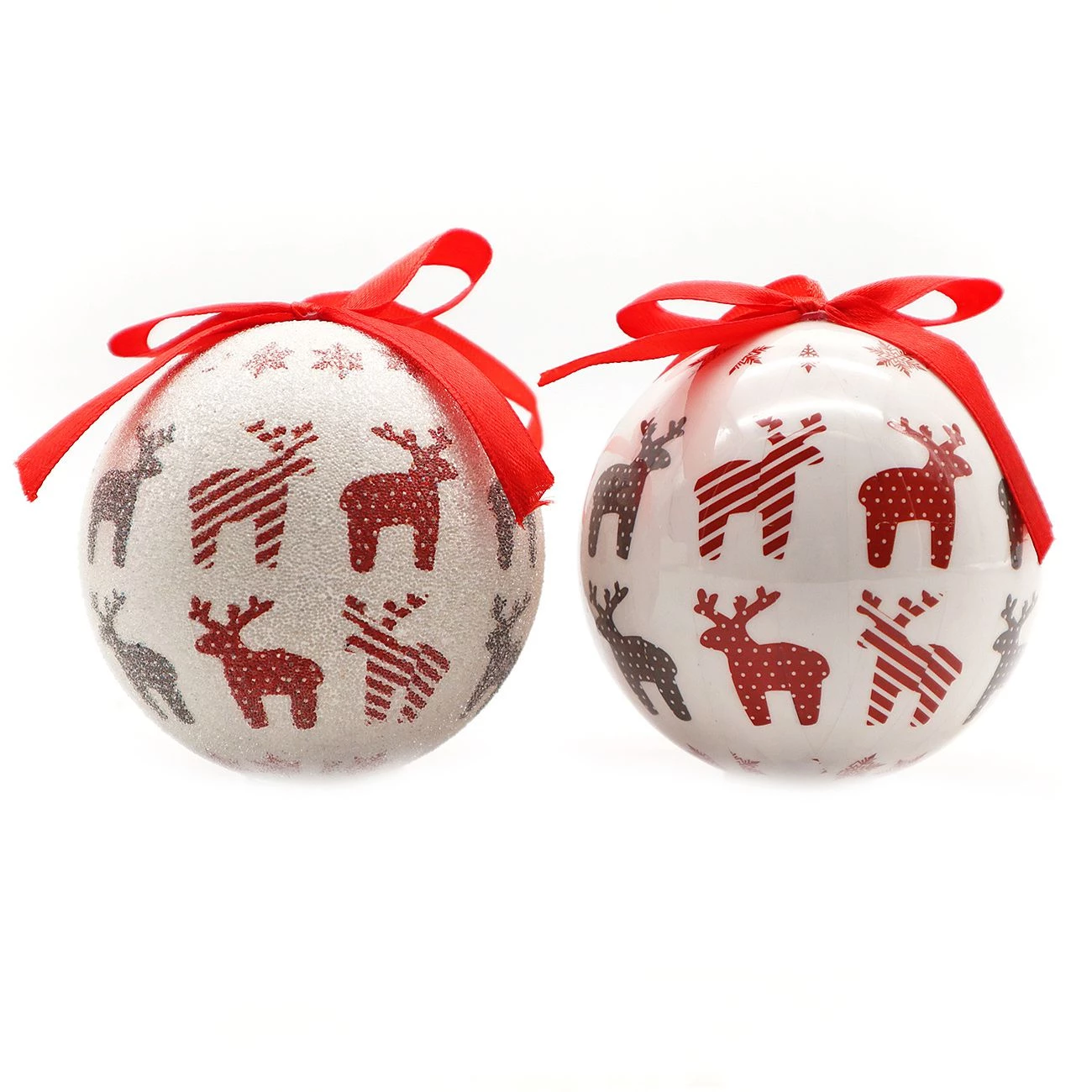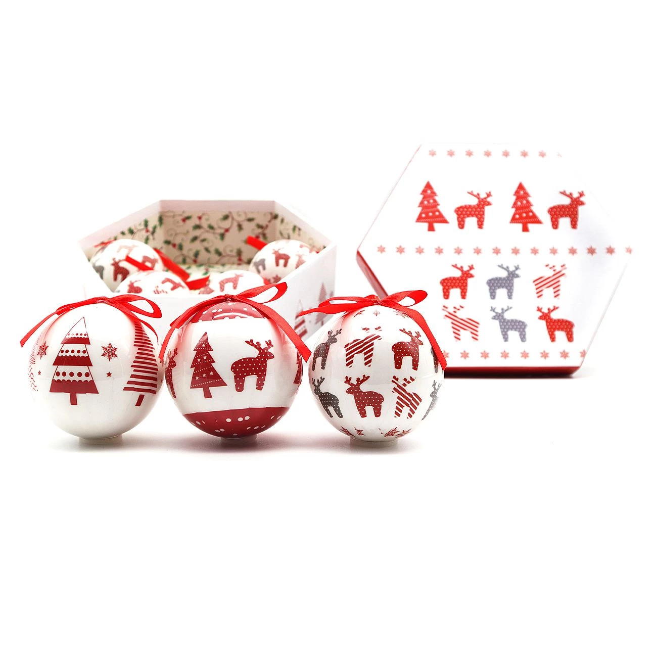 Komplet 7 kroglic 7,5cm, v lepi dekorativni novoletni škatli z motivom jelenčkov in smrečic. Kroglice so belo-rdeče barve z različnimi motivi jelenčkov in smrečic.