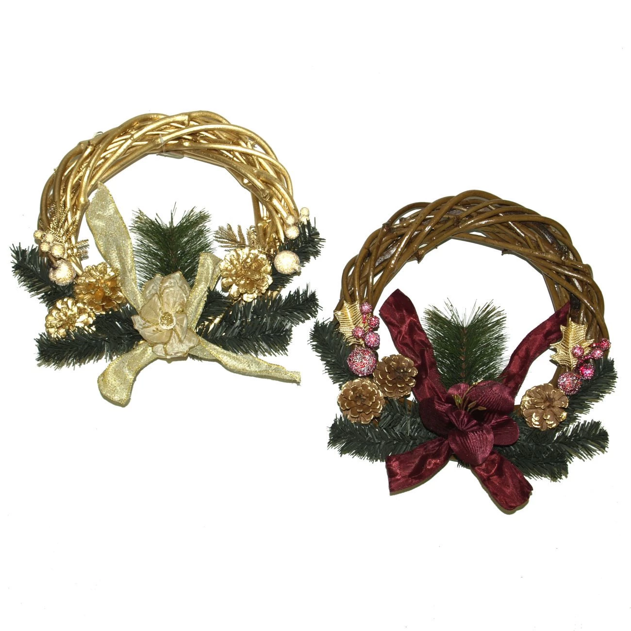 Zvite pobarvane veje, povezane z barvnimi trakovi in storži ter zelenjem. venček deluje naravno in umirjeno. Primeren za obešanje na vhodna vrata.