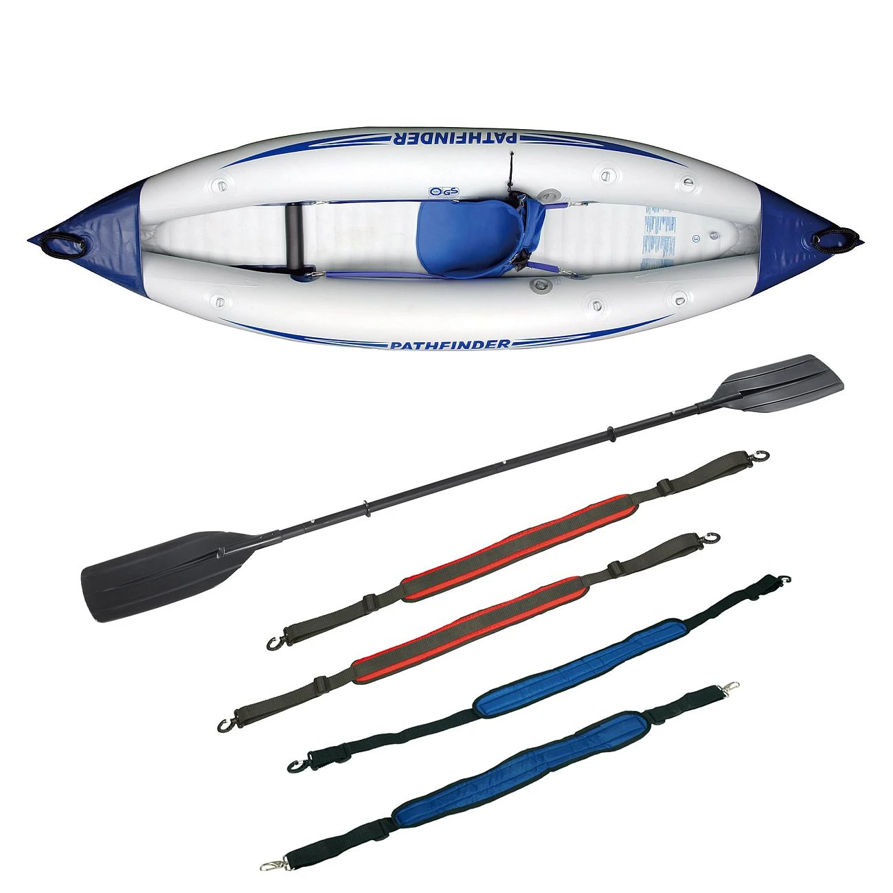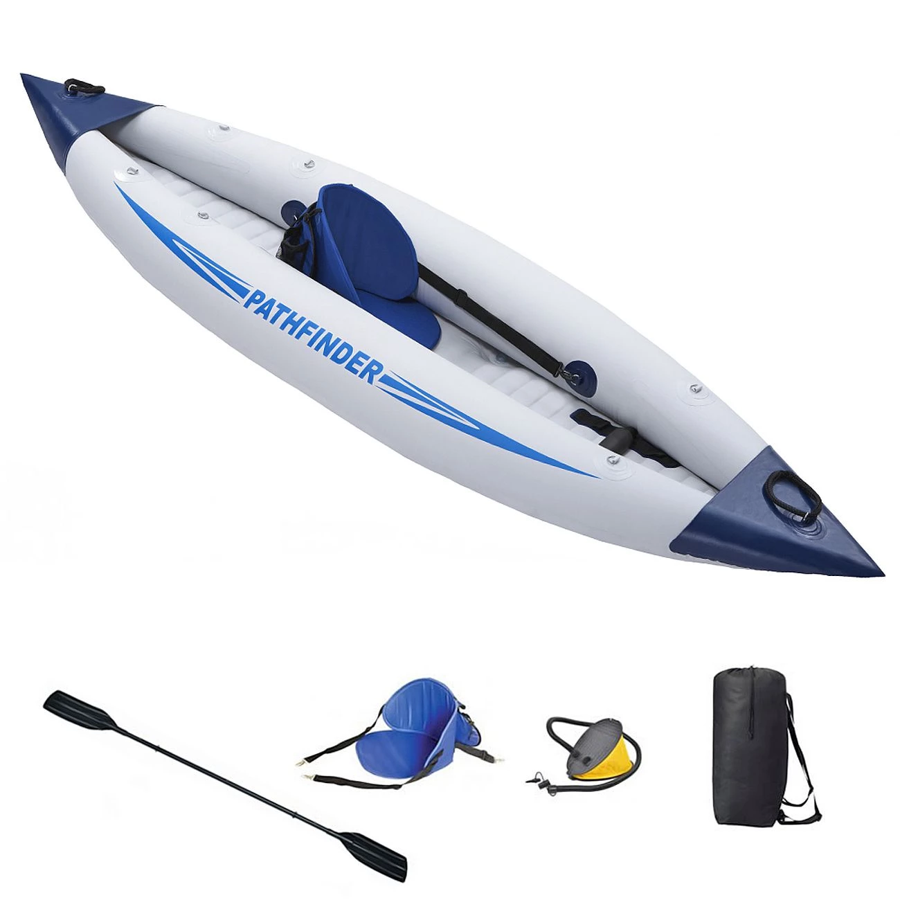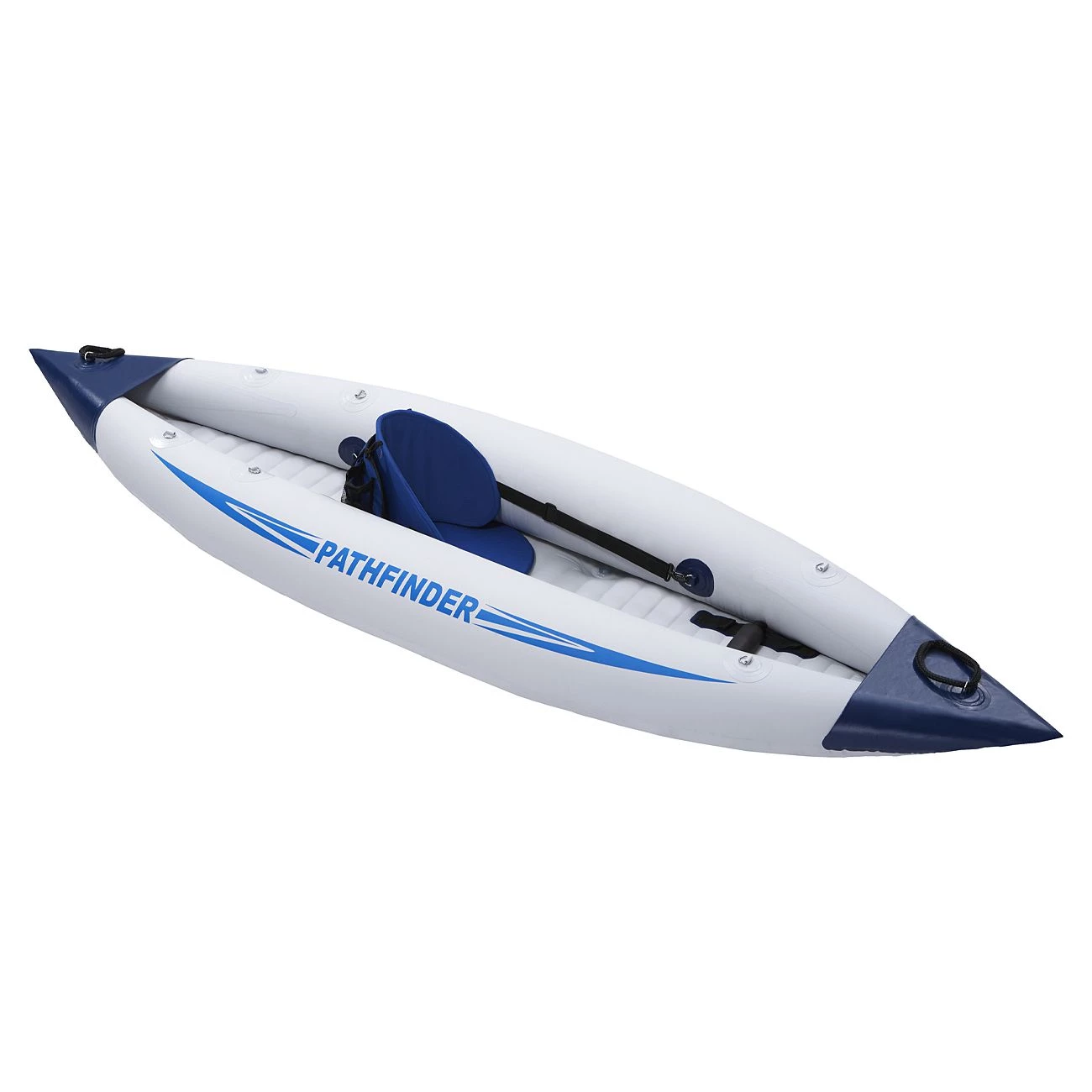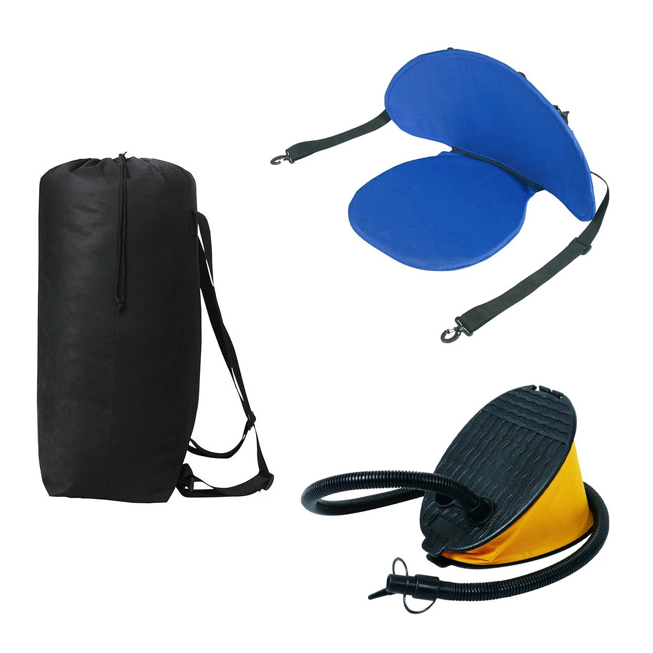 Kajak dim. 300x90 cm, za 1 osebo teže do 105 kg. Set vsebuje: kajak s 3 zračnimi komari, 1 sedež, 1 veslo, nožno tlačilko in torbo za shranjevanje in prevoz.