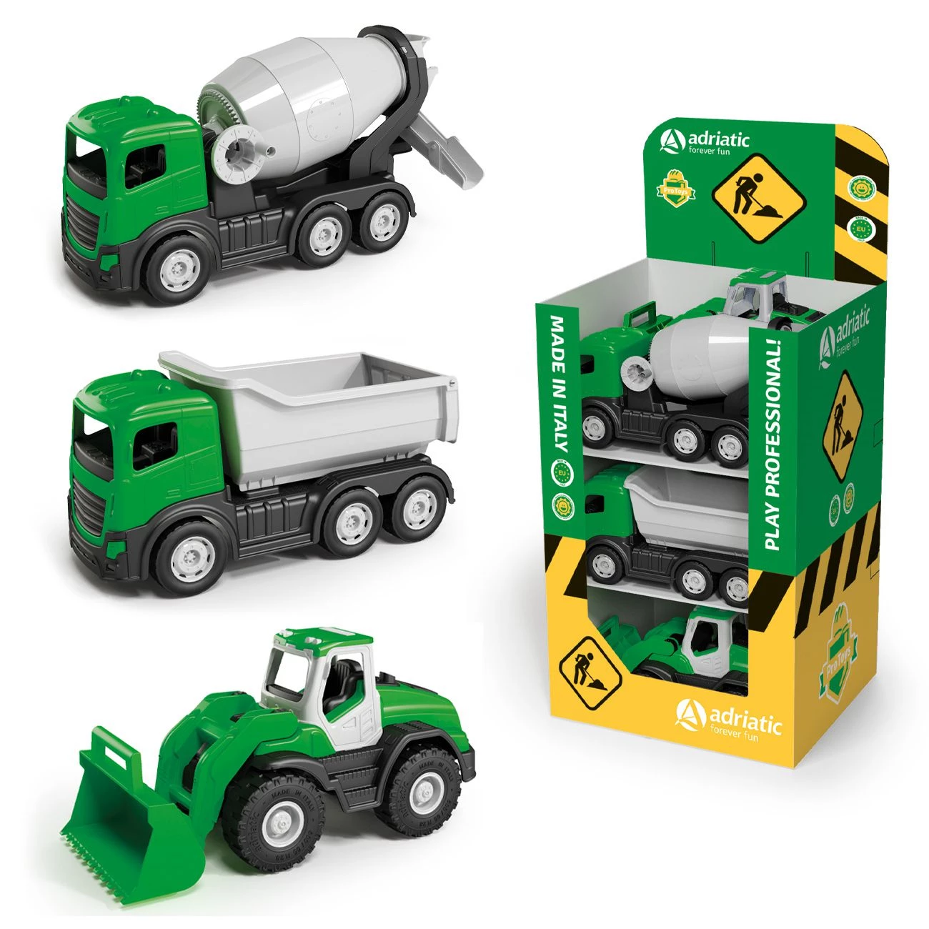 Gradbena vozila v displayu 9 kos, 3 modeli, tovornjak, traktor, hruška. Različne velikosti od 37 - 40 cm. Velikost tovornjaka: 37 x 15 x 17,5 cm Velikost traktorja: 38 x 17 x 18,5 cm Velikost hruške: 40 x 15 x 22 cm.