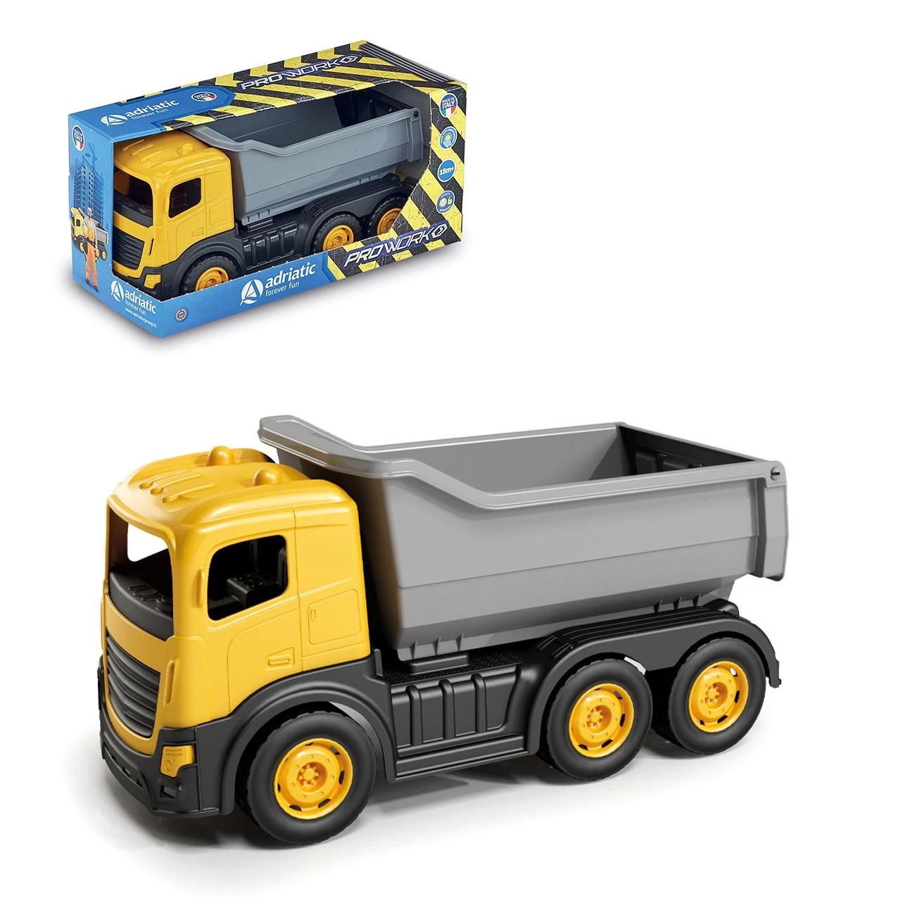 Tovornjak 37 cm, kiper s šestimi kolesi. Narejen iz trde kvalitetne plastike, odporne na sonce in vodo. Primeren za igranje v zaprtih prostorih in na prostem. Velikost: 37 x 15 x 18 cm. Primerno za otroke od 18 mesecev dalje.