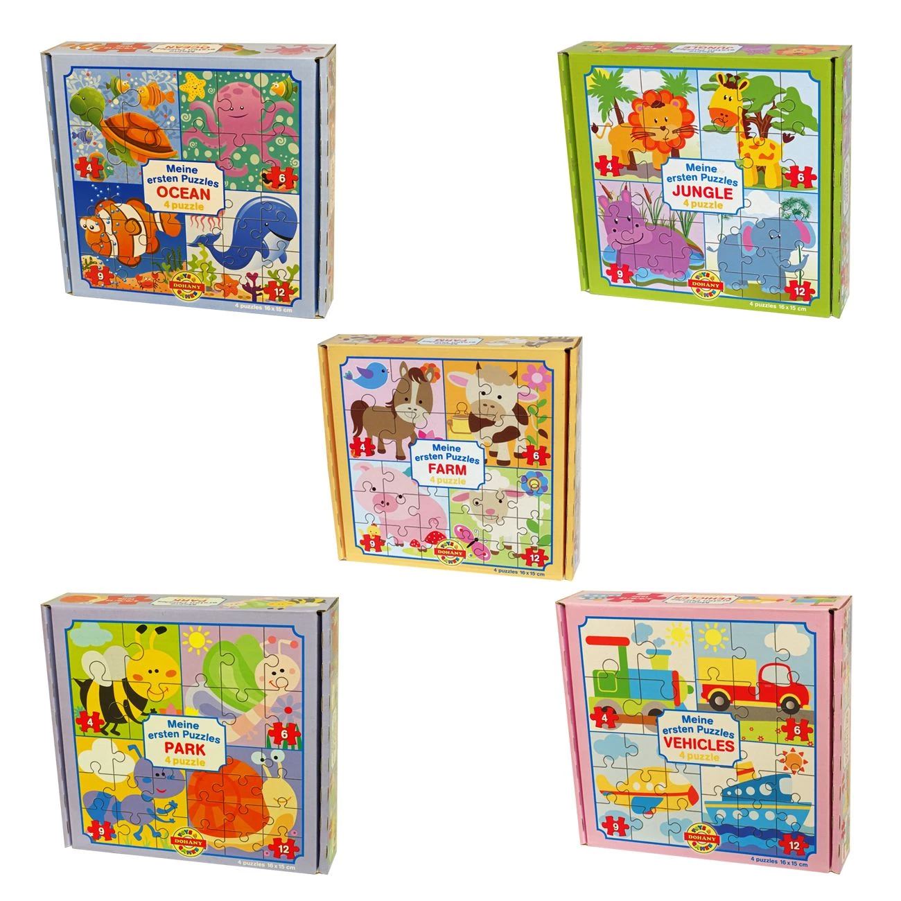 Sestavljanke za otroke, poslikane z motivi: morje, kmetija, džungla, park in avtomobili. Dimenzija sestavljanke: 16x15 cm. Sestavljenka v delih: 4-6-9-12 ( koščkov puzzli). Priporočeno za otroke od 2. do 6. leta starosti.