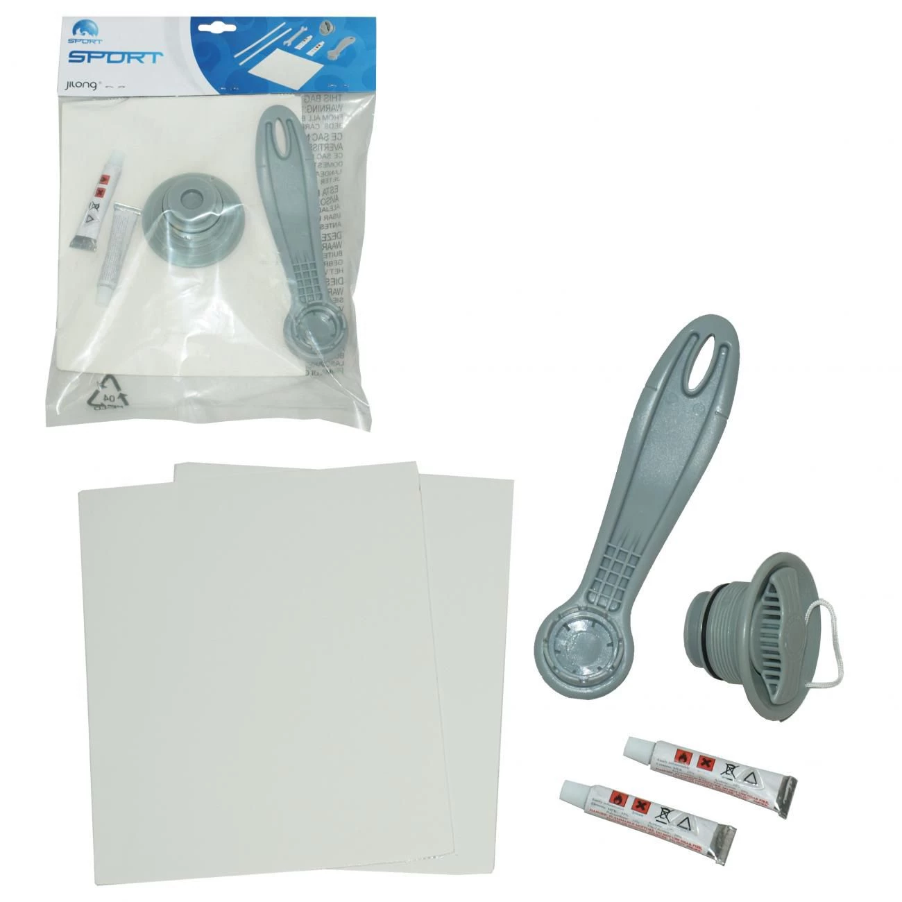 Set vsebuje: lepilo ( 3x5g), 2 krpici, 1 kovinski ključ za zategovanje matic,čep za ventil.