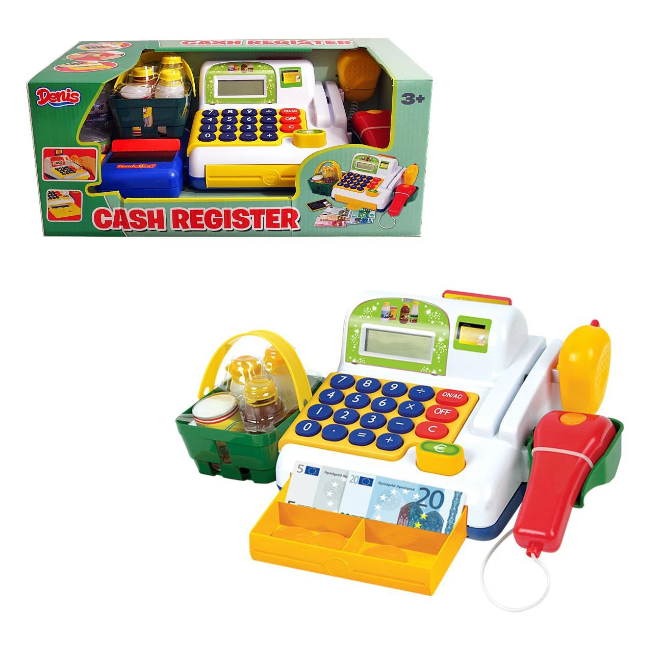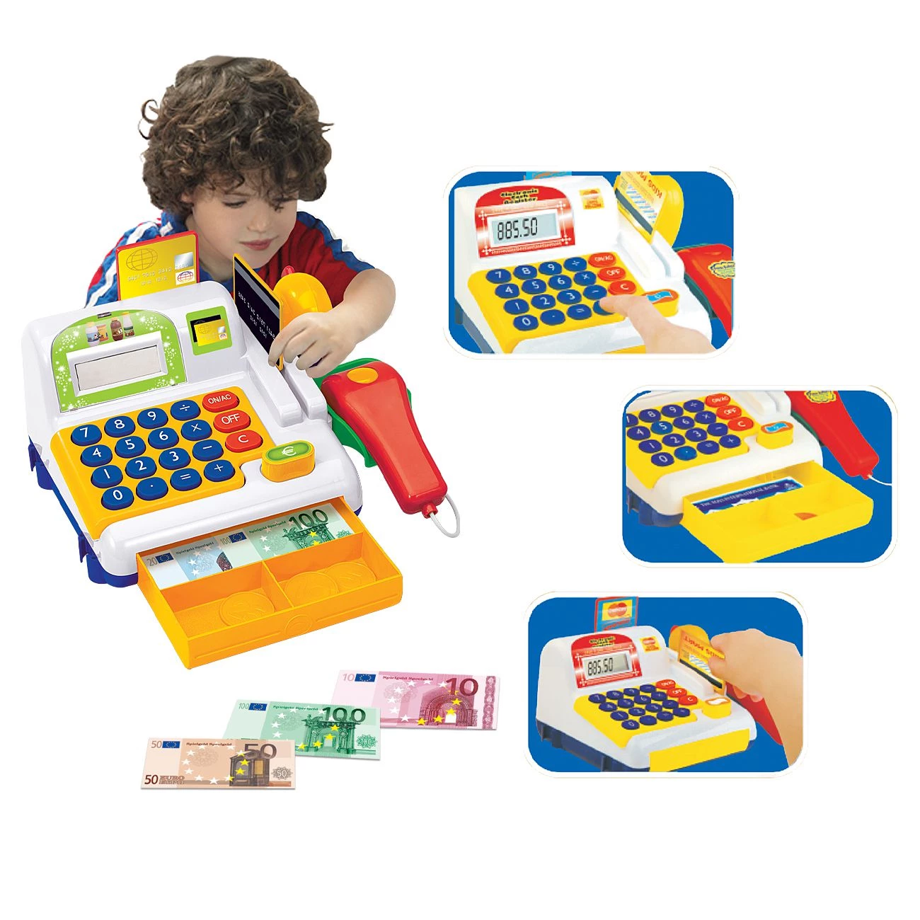 Blagajna vsebuje skener, pomični trak, živila, košarico,kreditne kartice in denar (evre). Različni zvočni efekti. Potrebujete 2 bat. AA, 1,5V, ki nista priloženi. Primerno za otroke od 3 let dalje.