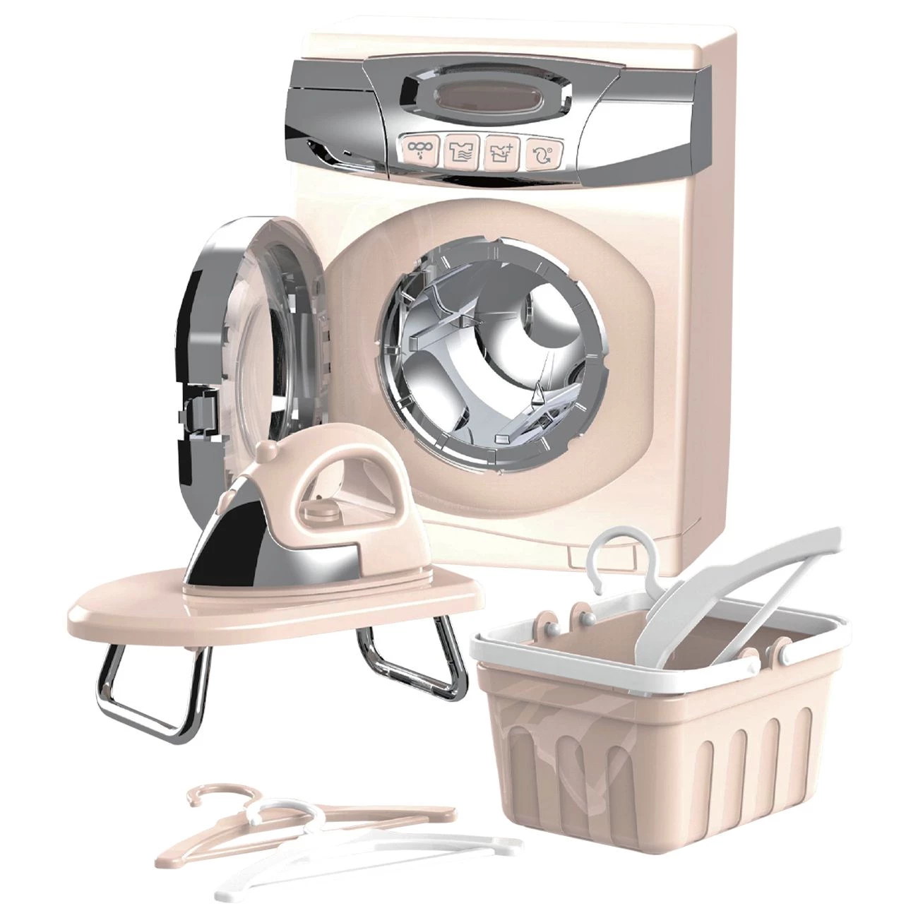 Set za pranje perila. Premična vrata, funkcionalne tipke, boben se vrti znotraj mašine. V setu je košara za perilo, ščipalke, likalnik in deska za likanje. Dimenzije: 13.5 x 17.5 cm Primerno za otroke od 3 let dalje.