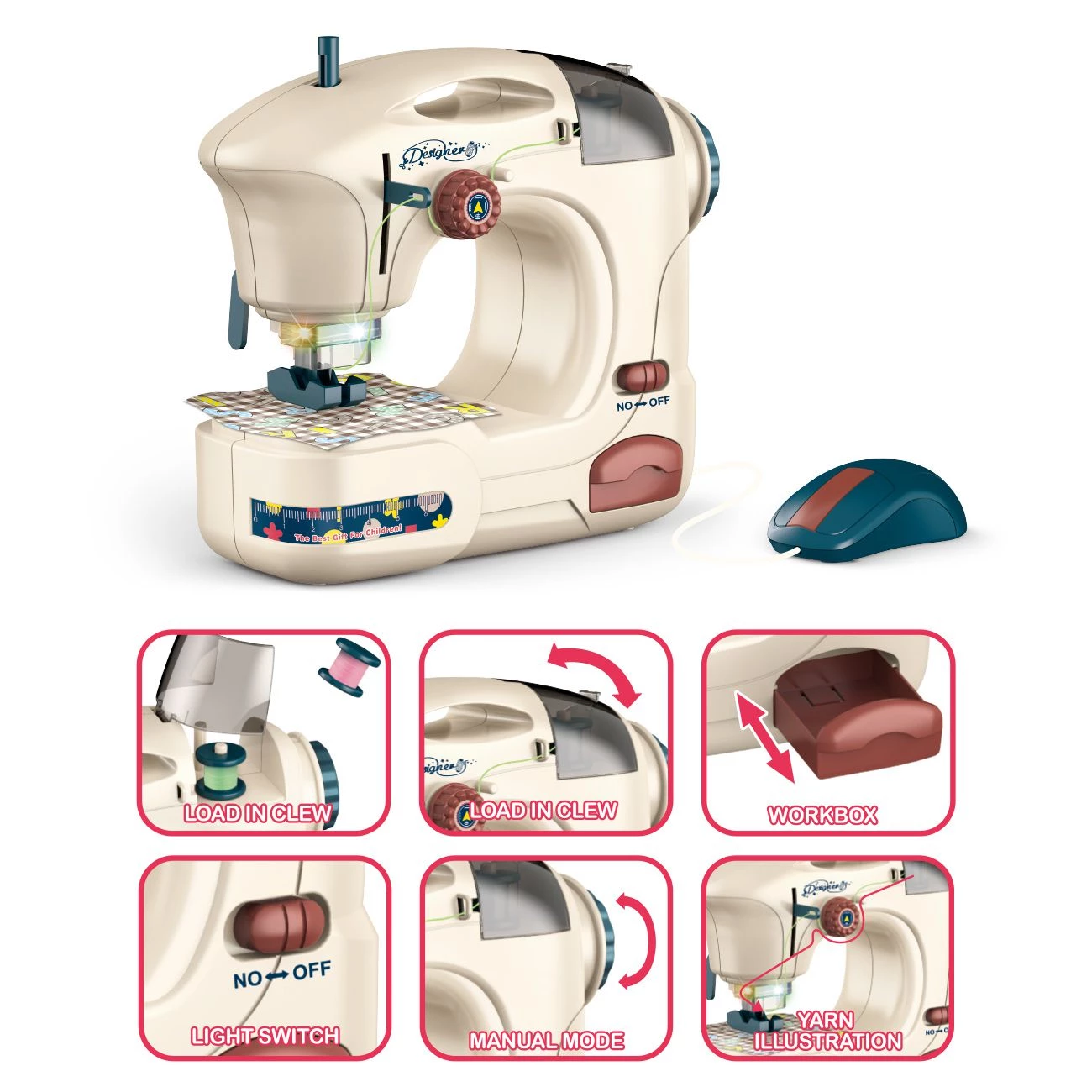 Šivalni stroj, velikosti 14,5 x 20 x 9 cm. Šivaj z nitko, ki je priložena. Čisto sam/a zašij strgane hlače na kolenu, ker mama nima časa. Ker sveti lučka in stroj oddaja zvoke melodije, je šivanje res cool. Potrebujete 3xAA baterije, ki niso priložene. Primerno za otroke stare 3 leta in več.