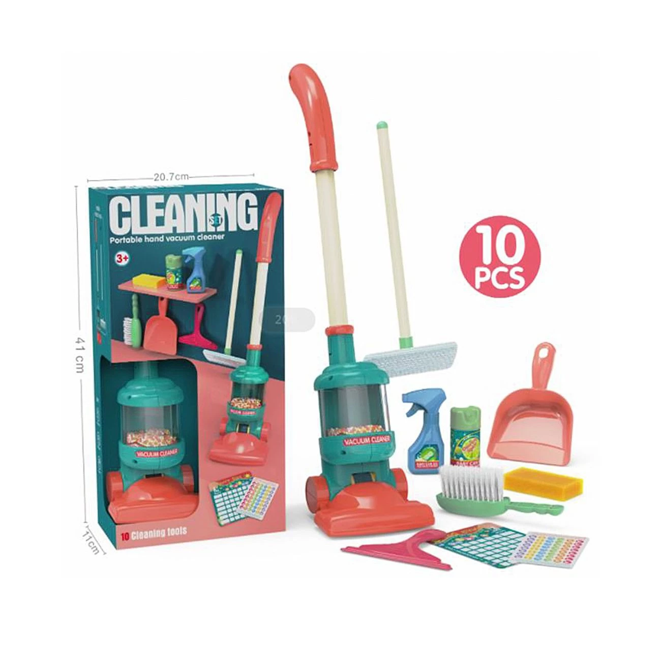 Set za čiščenje - 10 delni Vsebina kompleta: sesalec, metlica,smetišnica, čistilo, krpe, čistilec stekla, metla za mokro čiščenje, gobica, krpice,osvežilec. Sesalec je z zvočnimi in svetlobnimi efekti. Za delovanje so potrebne baterije, ki niso priložene. Primerno za otroke od 3 let dalje.