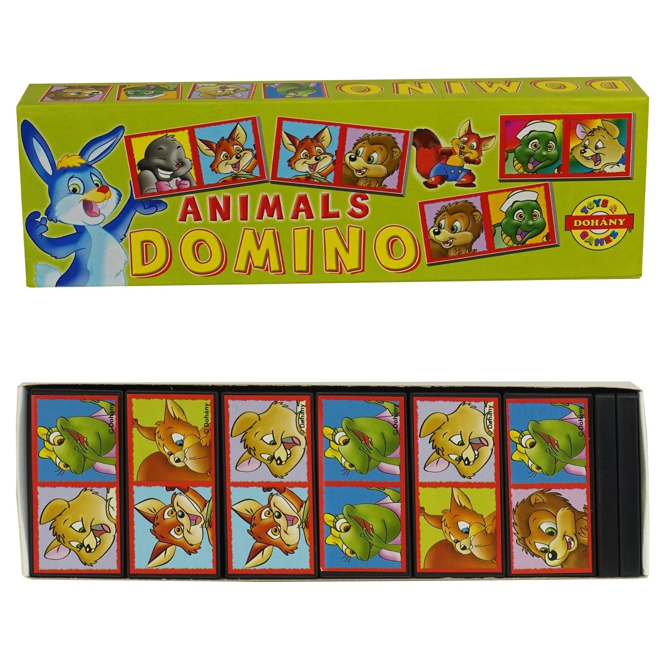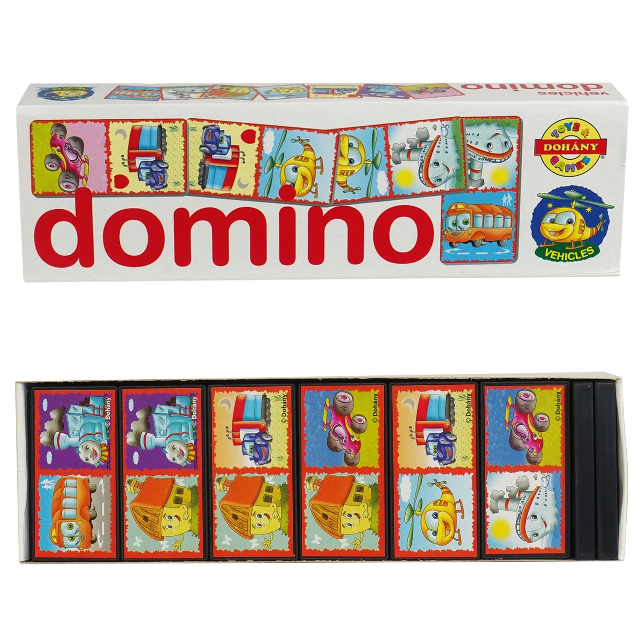 Družabna igra domino. Vsebuje 28 ploščic za igro, velikosti (7x3,5x0,7 cm), Na voljo so 3 različni motivi: sadje, vozila in živali. Primerno za otroke stare 3 leta in več.