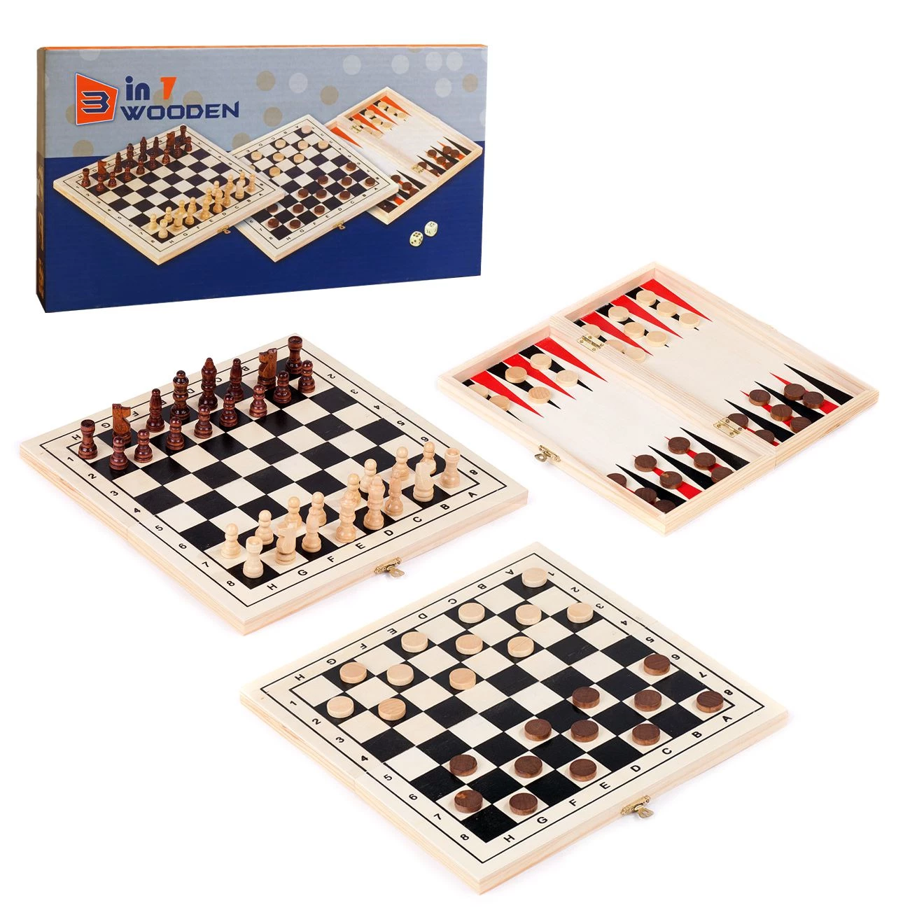 Lesene igre v škatli 3 v 1. V setu 3 igre: Šah, Backgammon in Dama. Dimenzija: 29 x 29 x 1,6 cm. Primerna od 5 leta dalje.