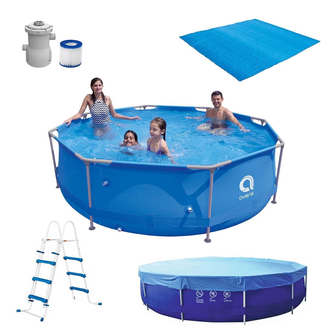 Bazen okrogle oblike. Dimenzije 450 cm x 122 cm Kapaciteta vode: 15233 l. Obložen s pvc, kovinska konstrukcija Vključuje: filter, črpalko, podlogo za tla, lestev in pokrivalo.