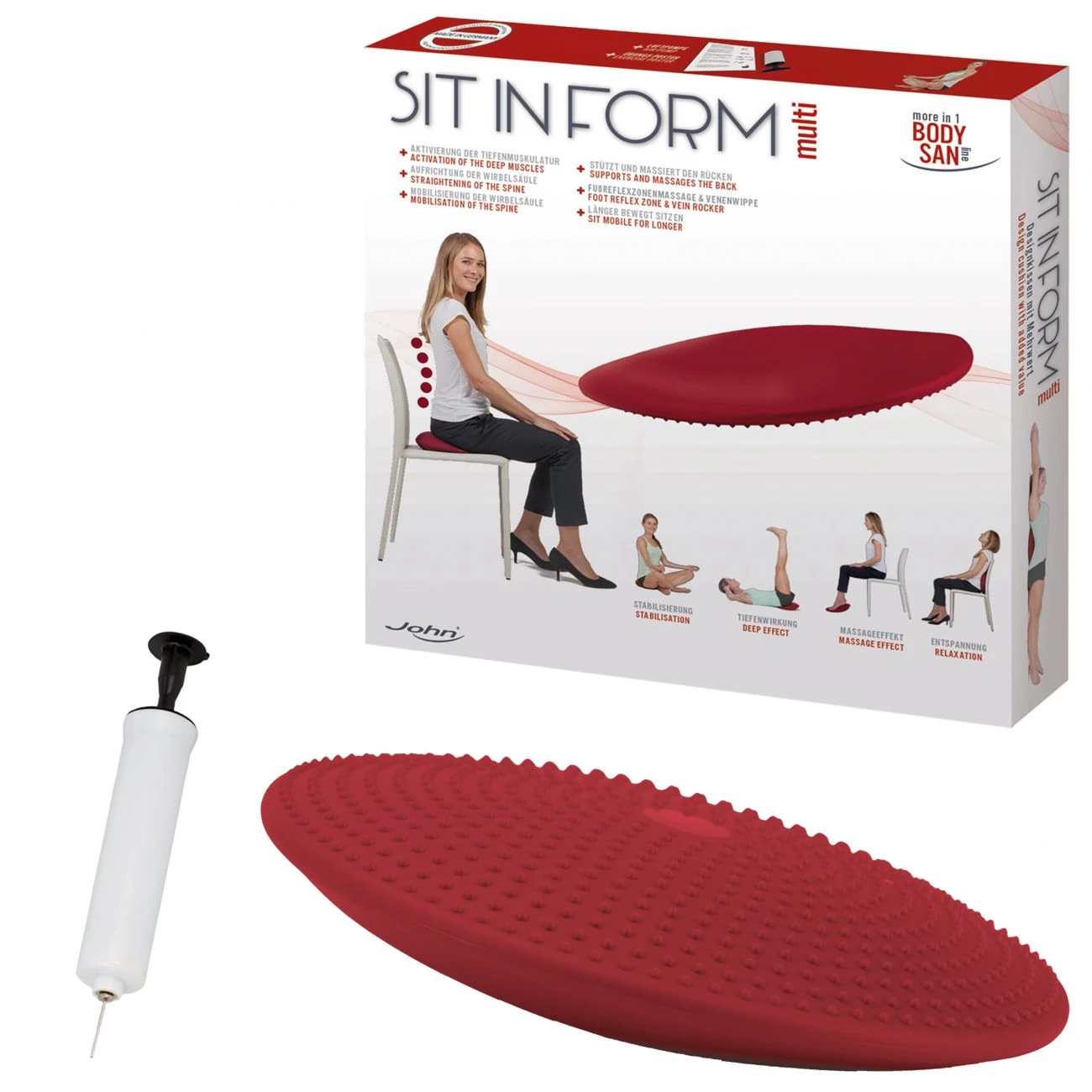 Gimnastična blazina za sedenje, premera 33 cm Vključena pumpa. Lahko služi tudi kot naslonjalo, ki masira hrbet in podlaga za masažo stopal.