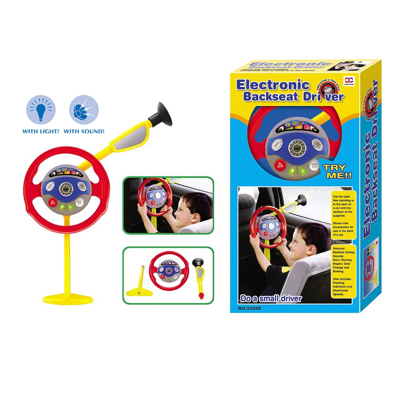Otroški volan s katerim lahko postaneš sovoznik svojim staršem. Volan pritrdite zadaj na steklo in otrok bo neizmerno užival v vožnji. Na volanu so tipke: start, stop, smerokaz, troblja in prestave. Za delovanje so potrebne 3xAA (1,5V) baterije, ki so priložene. Primerno za otroke od 3 let dalje.