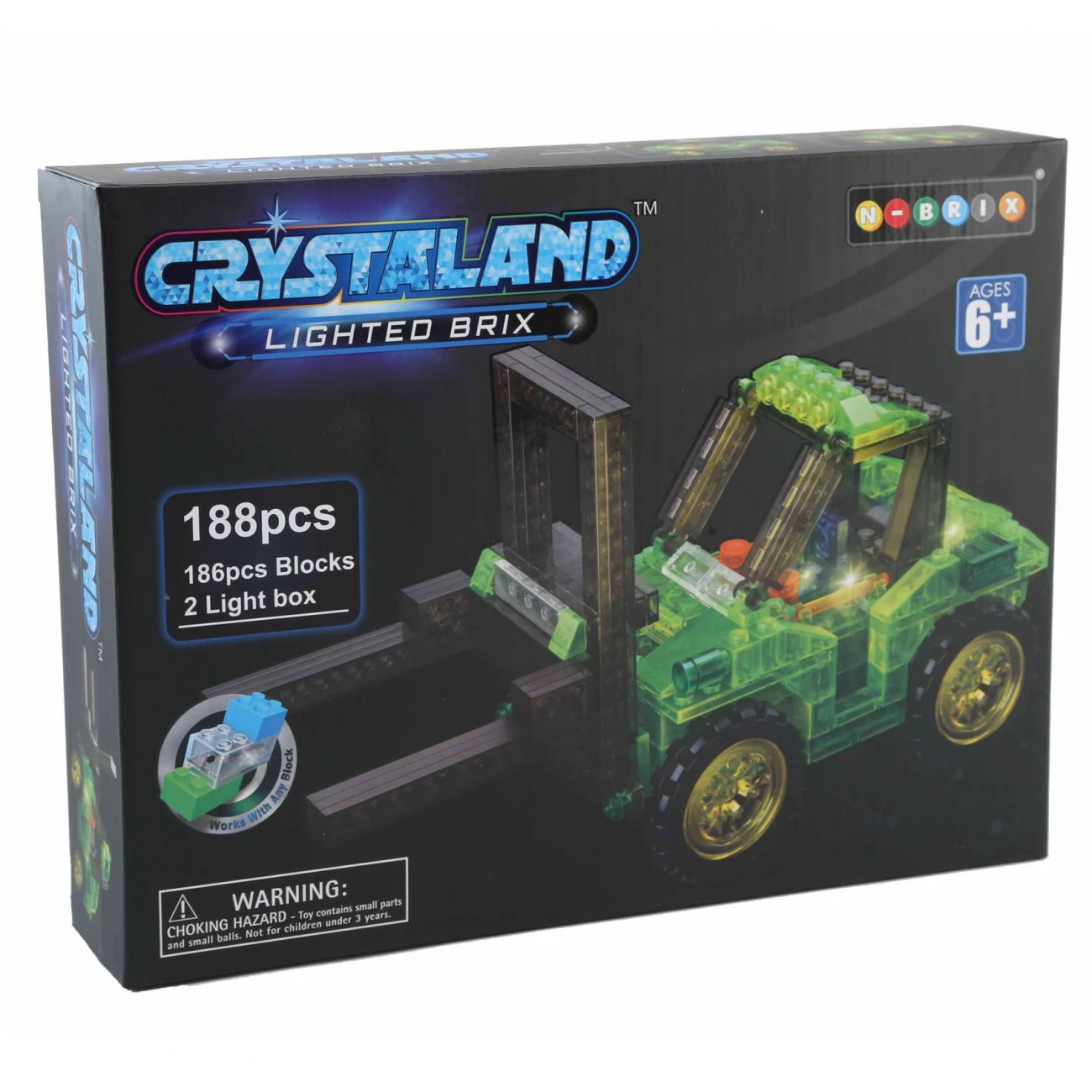 Crystaland večbarvne, prozorne svetleče kocke. V setu je 188 kock. Dve kocki z led sijalko in dajeta celotni konstrukciji poseben vizualni efekt(baterije 4xAG13-priložene) Kocke se lahko kombinirajo z vsemi podobnimi kockami. Primerno za otroke stare 6 let in več.