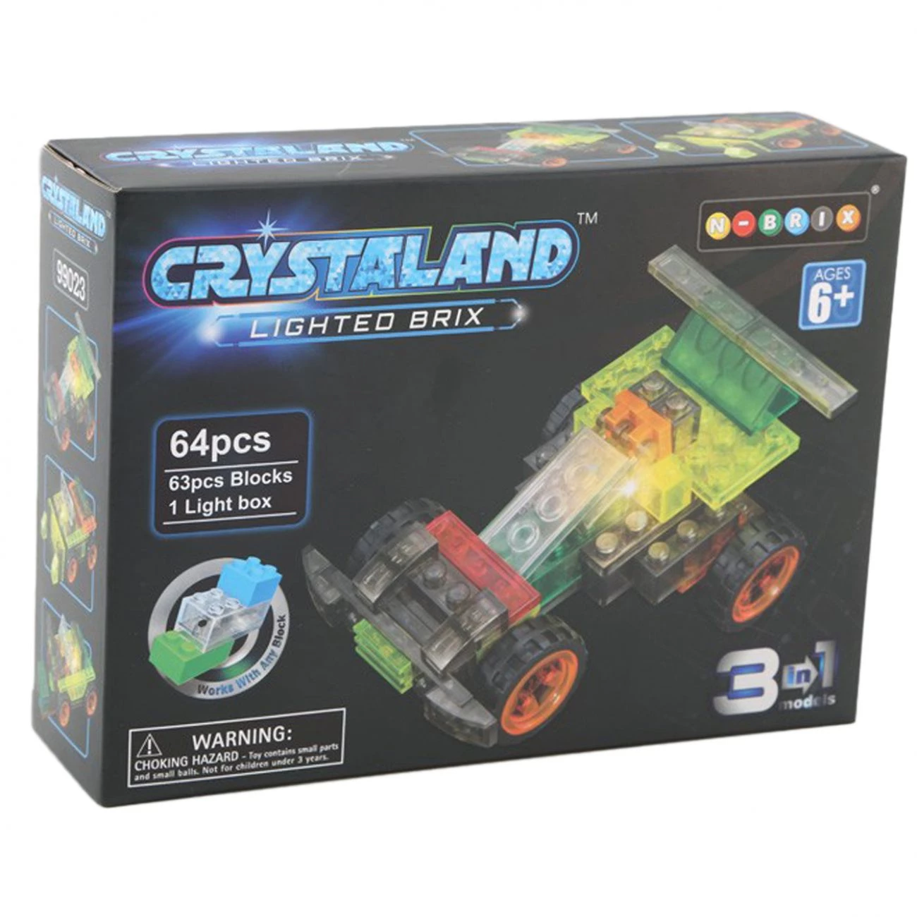 Crystaland večbarvne, prozorne svetleče kocke. V setu je 64 kock. Sestaviimo lahko 3 različna vozila. Ena kocka je z led sijalko in daje celotni konstrukciji poseben vizualni efekt(baterije 2xAG13-priložene) Kocke se lahko kombinirajo z vsemi podobnimi kockami. Primerno za otroke stare 6 let in več.