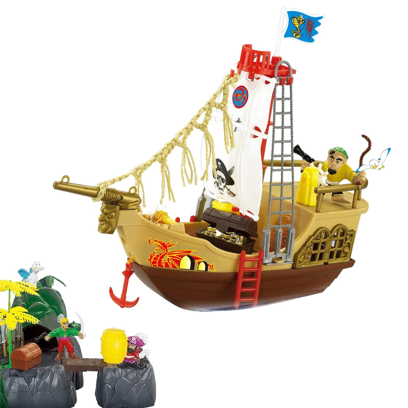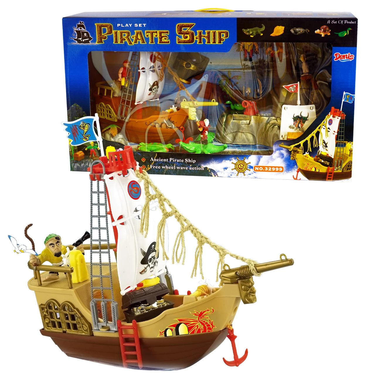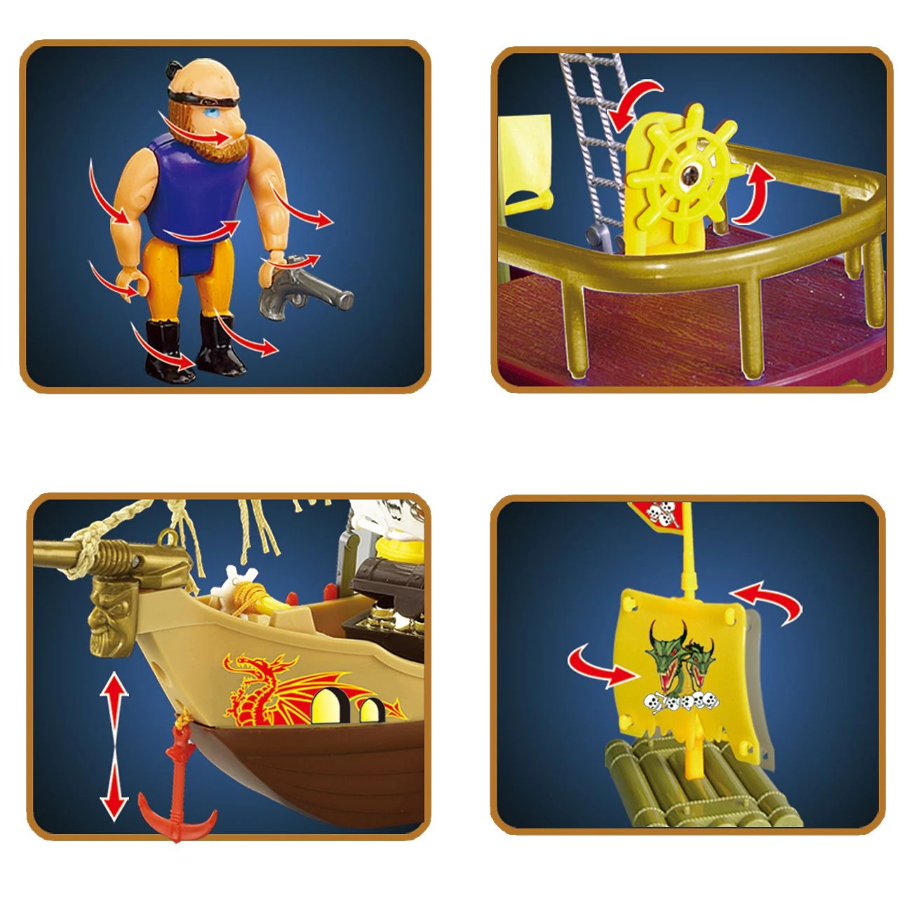 Set vsebuje ladjo 20 x 27 x 8 cm, 5 gusarjev (cca 5 cm), 20 kosov gusarskega pribora in morskih rekvizitov