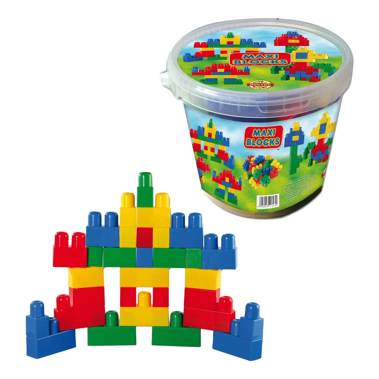 32 velikih kock dimenzije 6,5 x 3 cm. Osnovne barve in oblike so namenjene otrokom od 1,5 do 5 let. Priloženo vedro za shranjevanje.