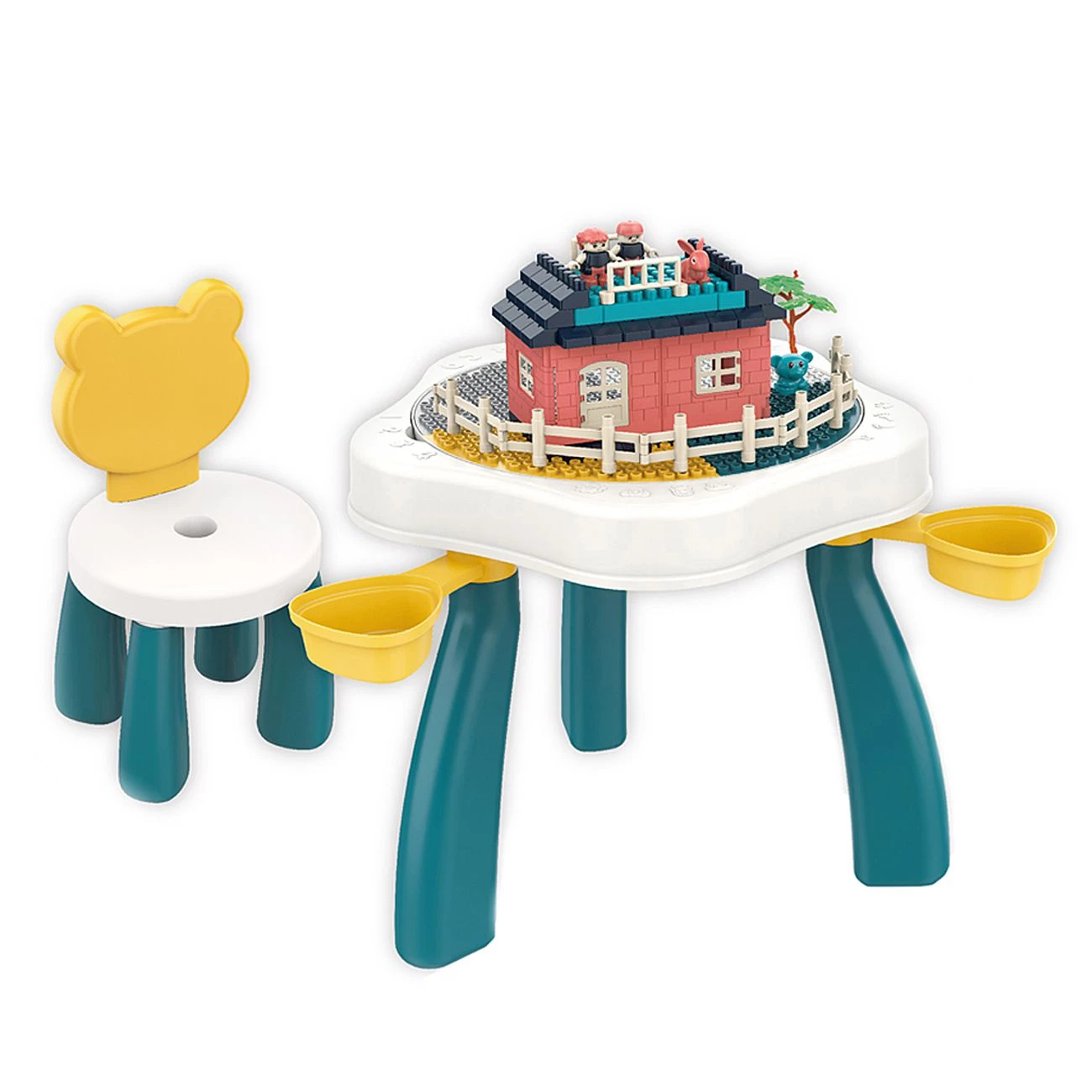 Multifunkcionalna miza s stolom. Na mizi otrok lahko riše, piše, se hrani, lahko uporablja za sestavljanje kock. Vsebuje prostor za shranjevanje pribora ali igračk, za odlaganje kock, krede itn. Dimenzije: ca. 80 x 54 x 57 cm. Primerno za otroke od 3 let dalje.