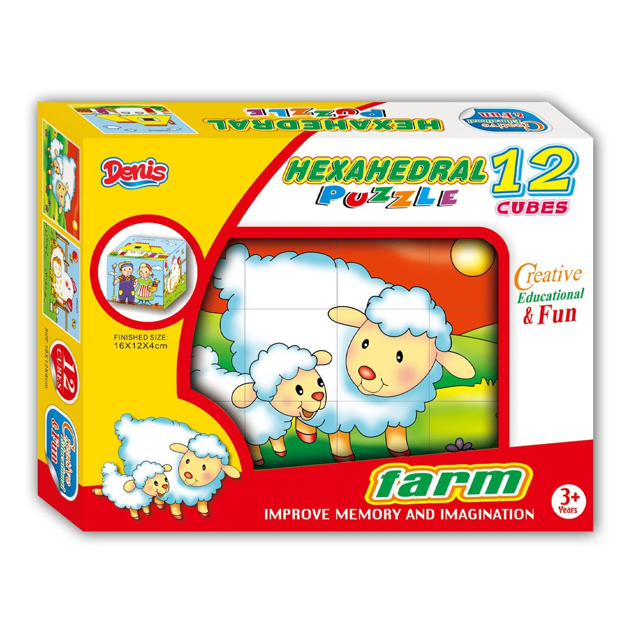 Kocke 12 kos Igra s kockami prispeva k razvoju fino motorike, koordinacije in koncentracije. Poslikava kock je z motivi kmetije. Dimenzija kock: 3,9 x 3,9 x 3,9 cm Dimenzija škatle: 22 x 17 x 4 cm Primerno za otroke od 3 let dalje.