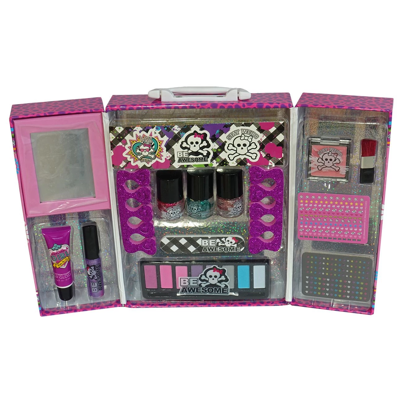 V kovčku so: Gloss za ustnice 6 in 12 ml. Senčilo za oči 7,2 g (7 različnih barv). Ličilo za lička 2,5 g. 3 x lak za nohte 5 ml. Nalepke za nohte, pilica in pripomoček za lakiranje nohtov. Punce morajo biti vedno urejene, zato moraš nujno imeti ta lepotilni set. Pokliči svoje prijateljice in skupaj se naličite. Primerno za deklice od 8 let dalje.