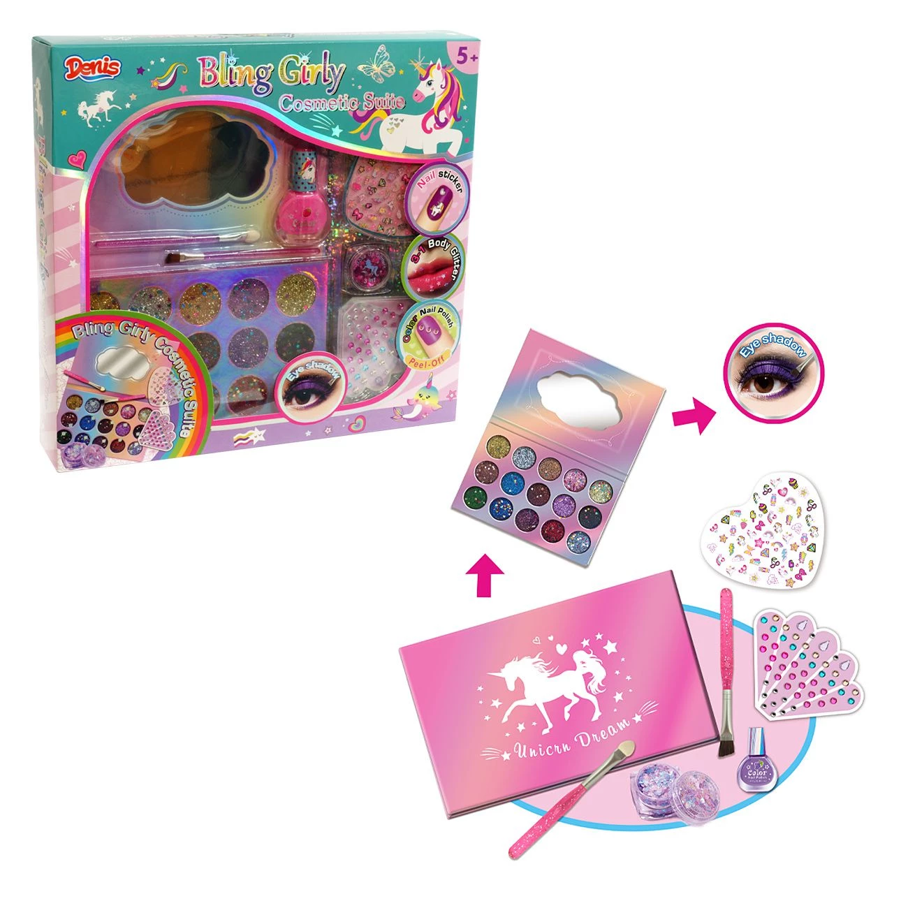 Kozmetični set otroški.Set vsebuje: Paleta senčil za oči 15 barv in ogledalo, dišeči lak za nohte, bleščice, nalepka za nohte, čopič in aplikator za senčila. Dimezija embalaže: 27 x 25,5 x 5cm. Primerno od 5 leta dalje.