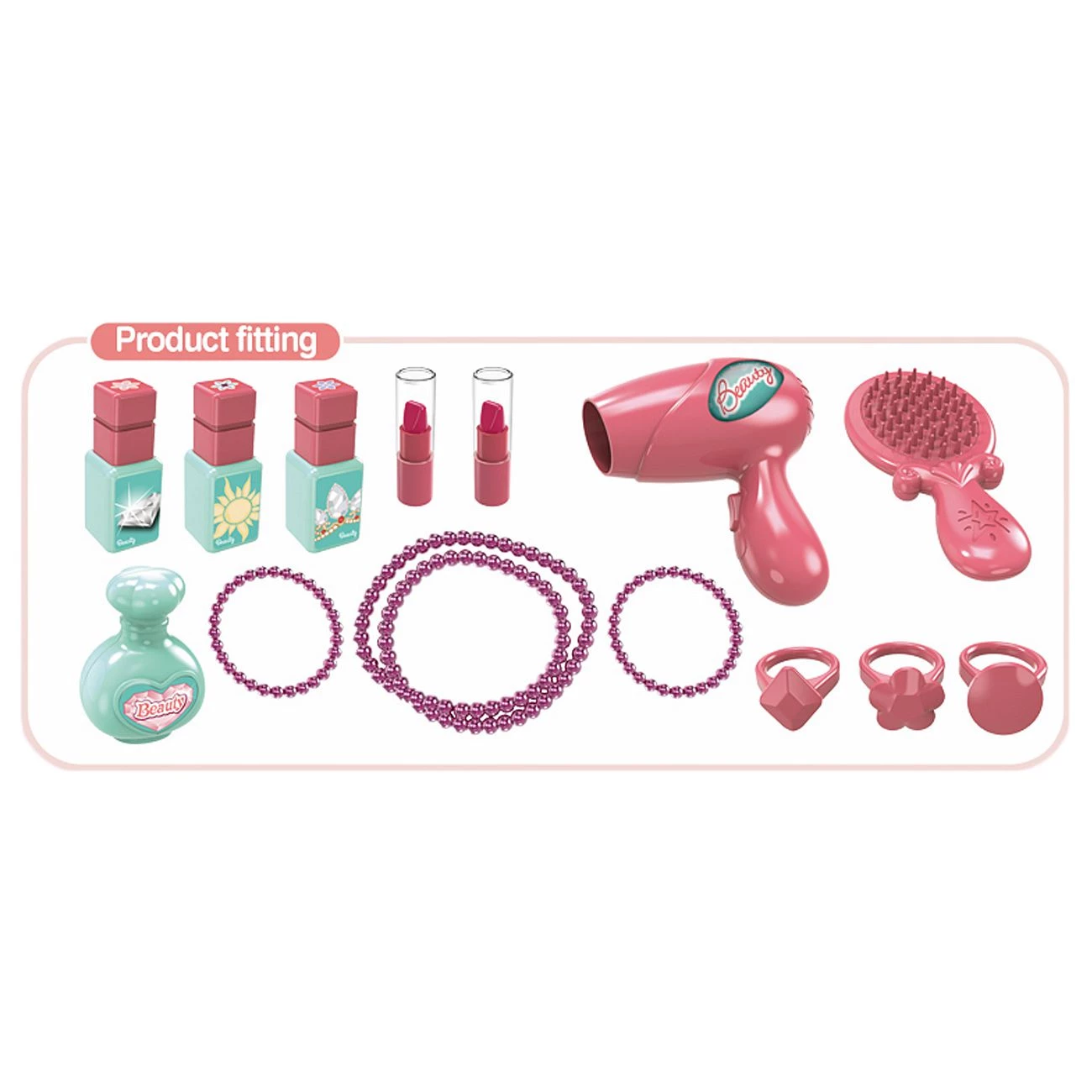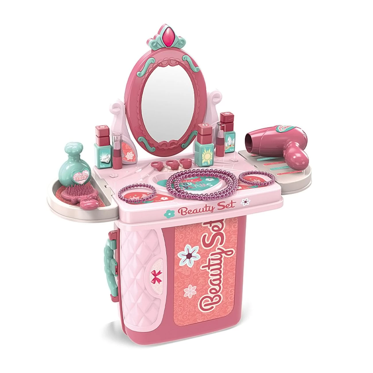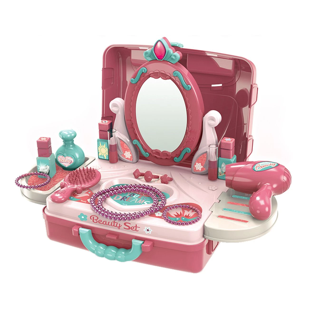 Praktični kozmetični komplet v kovčku, ki se hitro razpre v kozmetično mizico. Priloženi različni pripomočki: ogledalo, sušilnik za lase, glavnik, laki za nohte, parfum, ogrlica, zapestnica, sponka za lase. Material: trda plastika. Primerno za otroke od 3 let dalje.