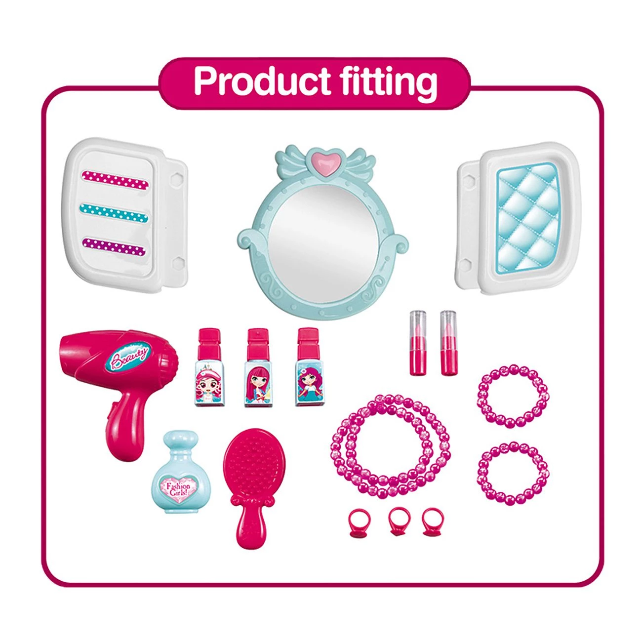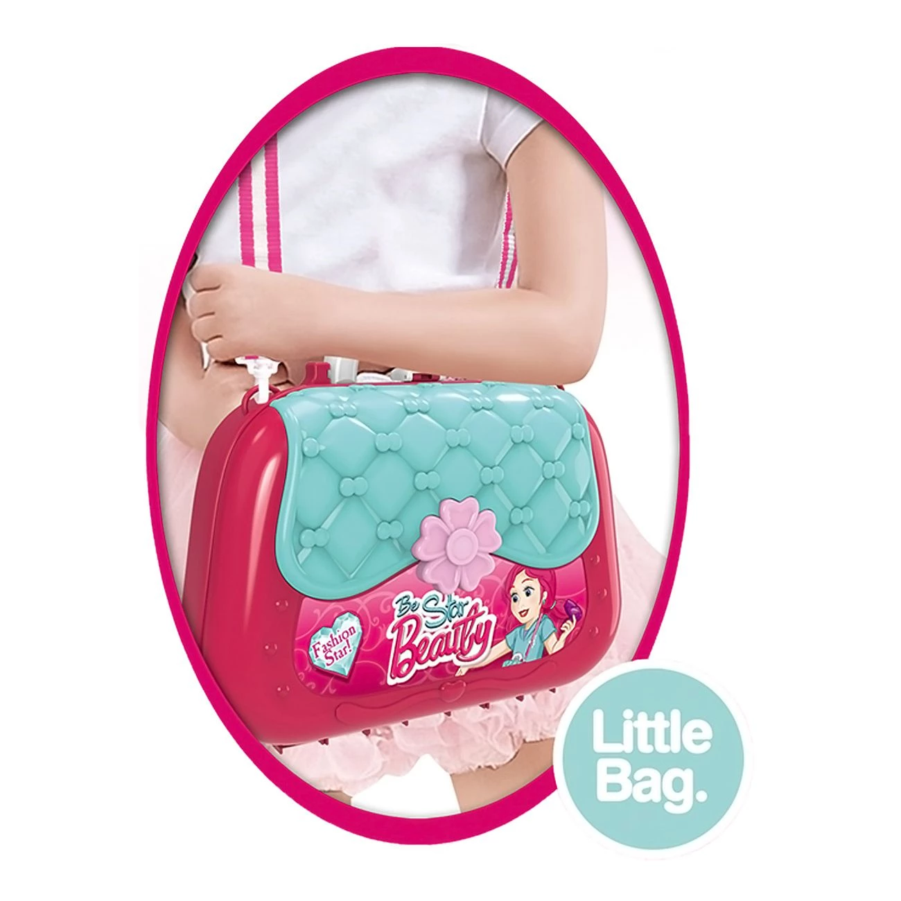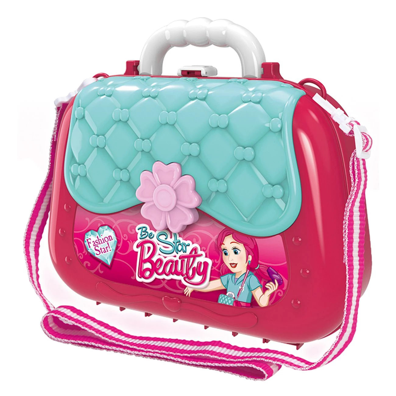 Kozmetični set v torbici.Elegantni dizajn, lahko se nosi na rami. Priloženi različni pripomočki: šminke, čopič, sušilnik za lase, nakit, ogledalo, steklenička za parfum in drugo. Zato je ta kozmetična torbica pravo darilo za modno osveščena dekleta saj se lahko igrajo v vlogi stilistke ali kozmetičarke. Dimenzije: 20,5 x 9 x 16,8 cm. Primerno za otroke od 3 let.