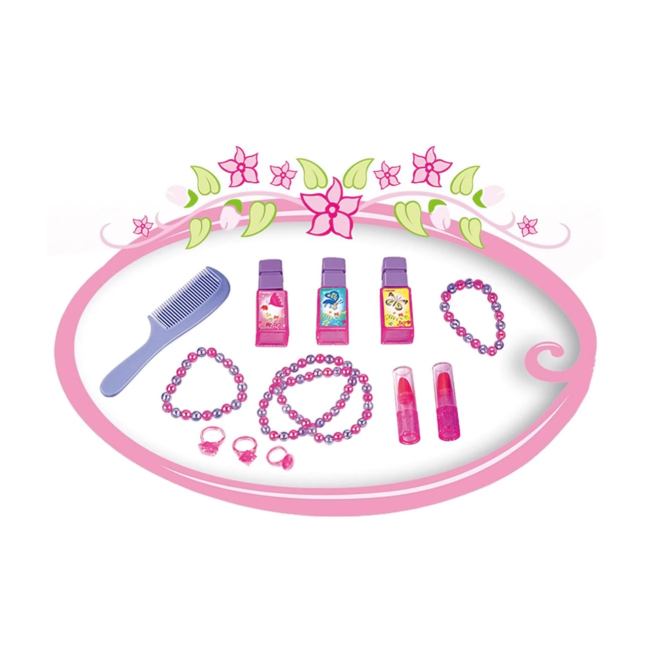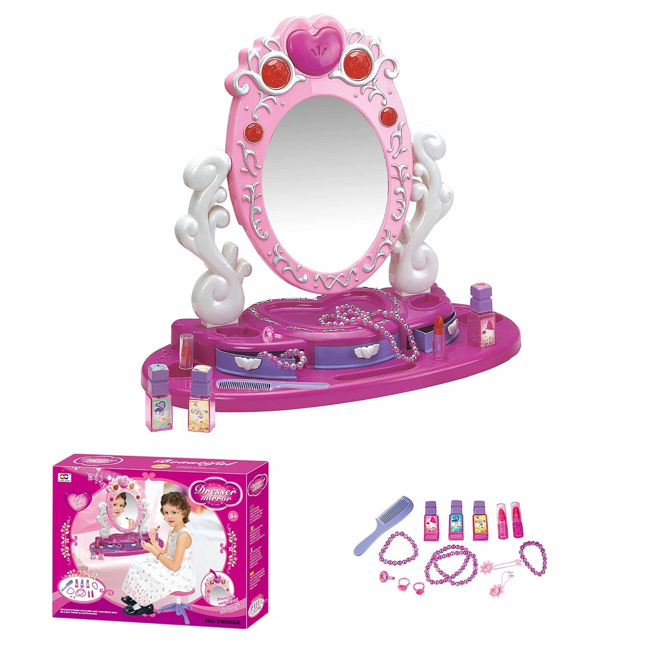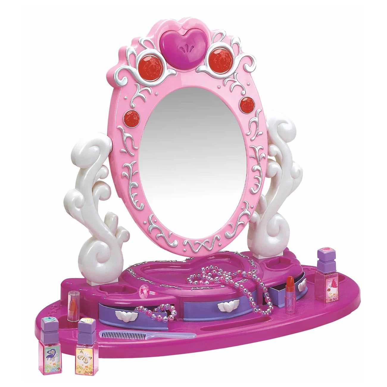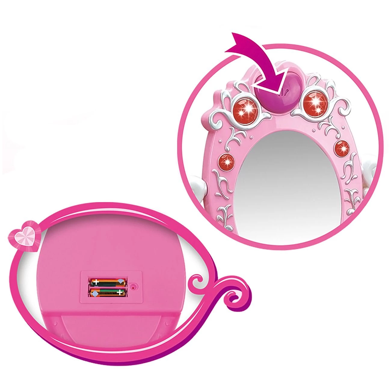 Kozmetično ogledalo velikosti 39 x 44,5 x 24,5 cm. Vsebuje 14 dodatkov.Šminke, stekenice za parfume,glavnik,nakit-zapestnice, prstani,okrasni trakovi za lase. Ogledalo ima lučke in zvočne signale. Material: trda plastka. Za delovanje so potrebne 2xAA baterije - niso priložene. Primerno za otroke od 3 let.