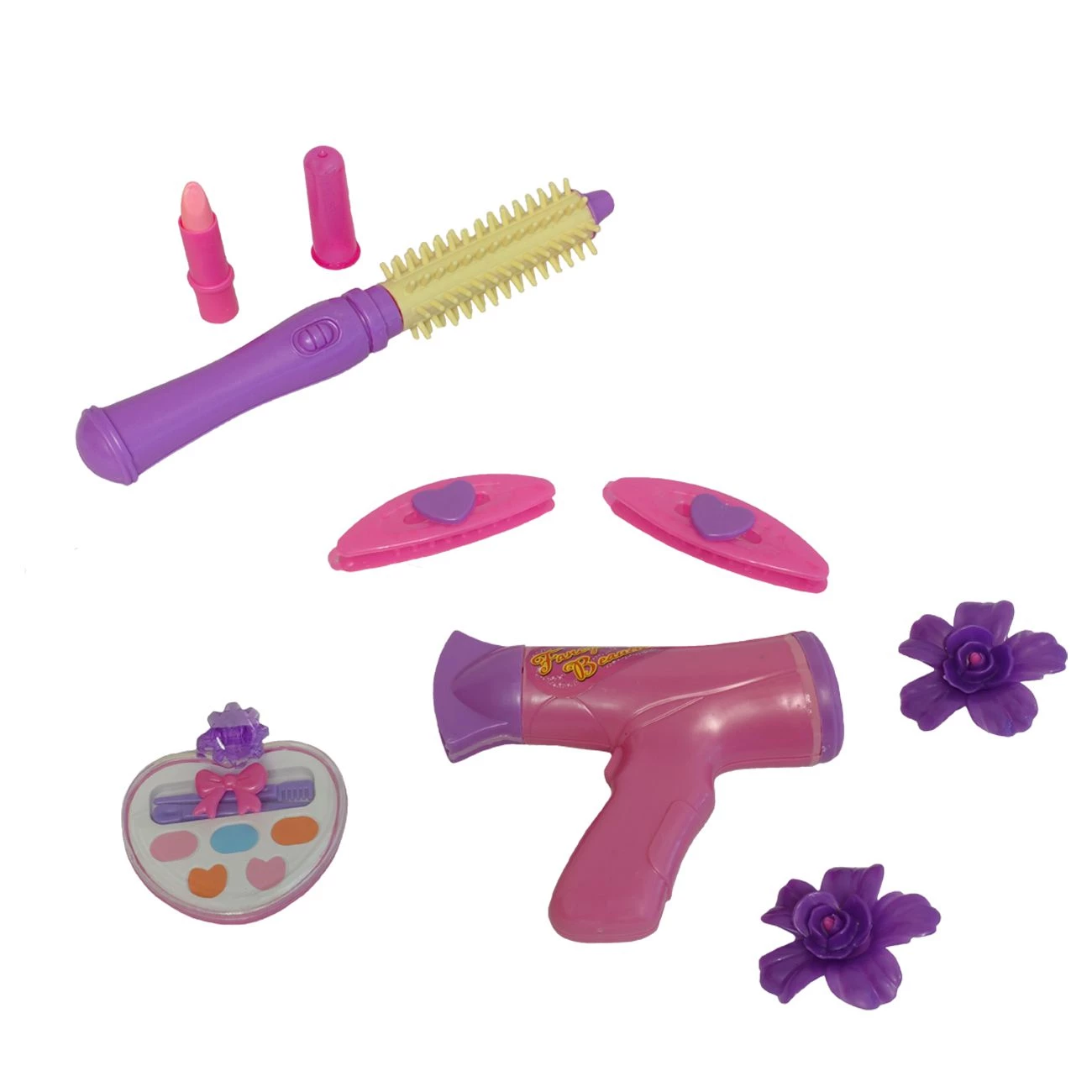 Torbica velikosti 24 x 20 cm vsebuje: sušilec za lase, krtačo, prstan z nastavki, dve lasnici in ličila v škatlici. Ličila niso prava-le iz plastike, za izdelek ne potrebujete baterij. Primerno za otroke od 3 let dalje.