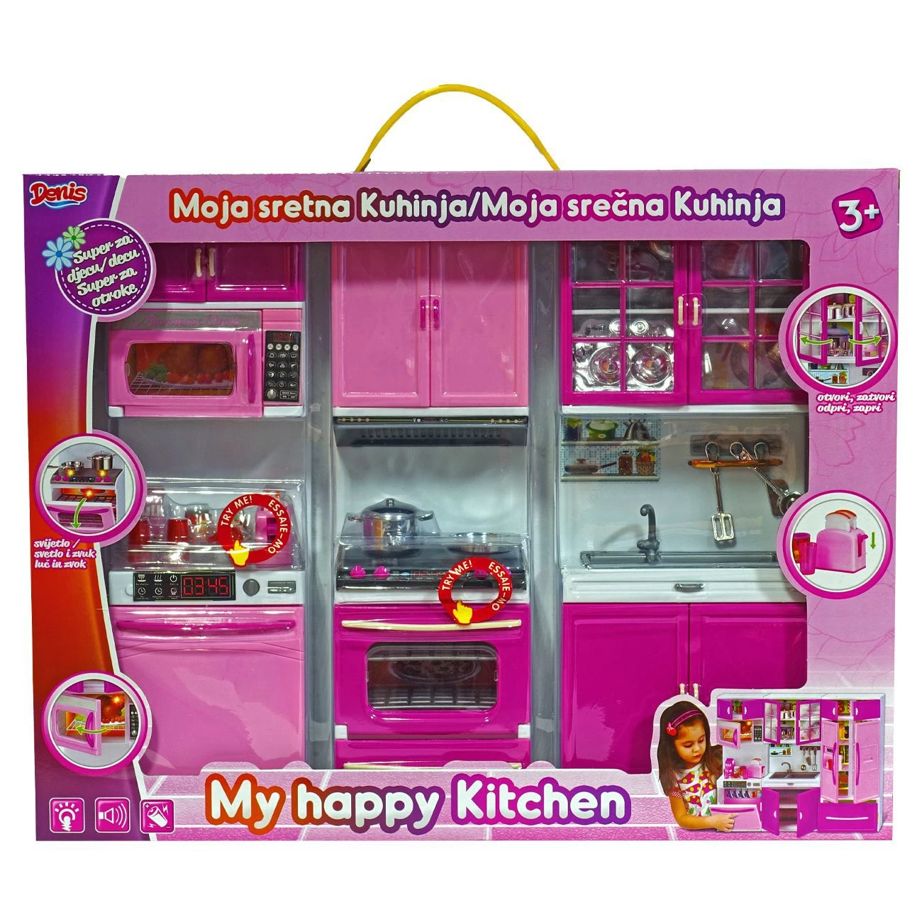 Mini kuhinja za tvojo punčko z zvoki in svetlobo. V kompletu: 3x kuhinjski moduli, mikorovalovna pečica, pralni stroj, štedilnik, pomivalno korito, kuhinjski elementi, ki se odpirajo, ter dodatki. Velikost elementov v kompletu: 31x11x7 cm. Na voljo več vrst. Za delovanje so potrebne baterije 3xAG13 - priložene. Primerno za otroke od 3 let dalje.