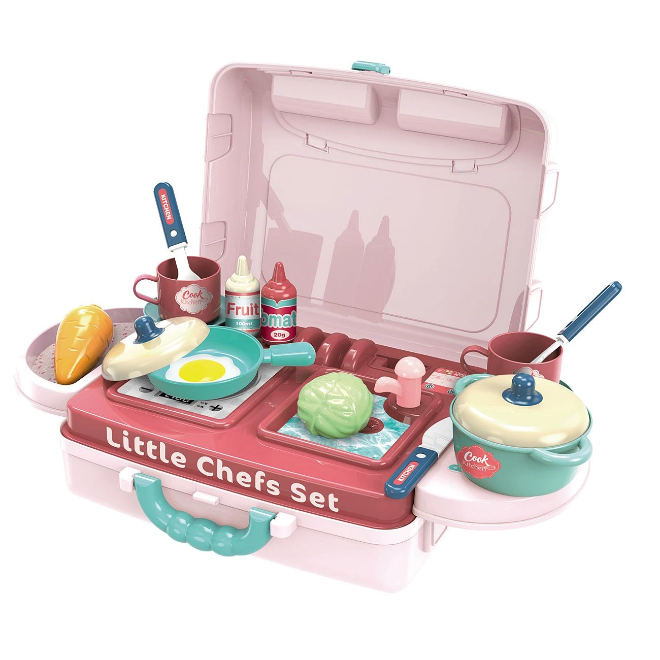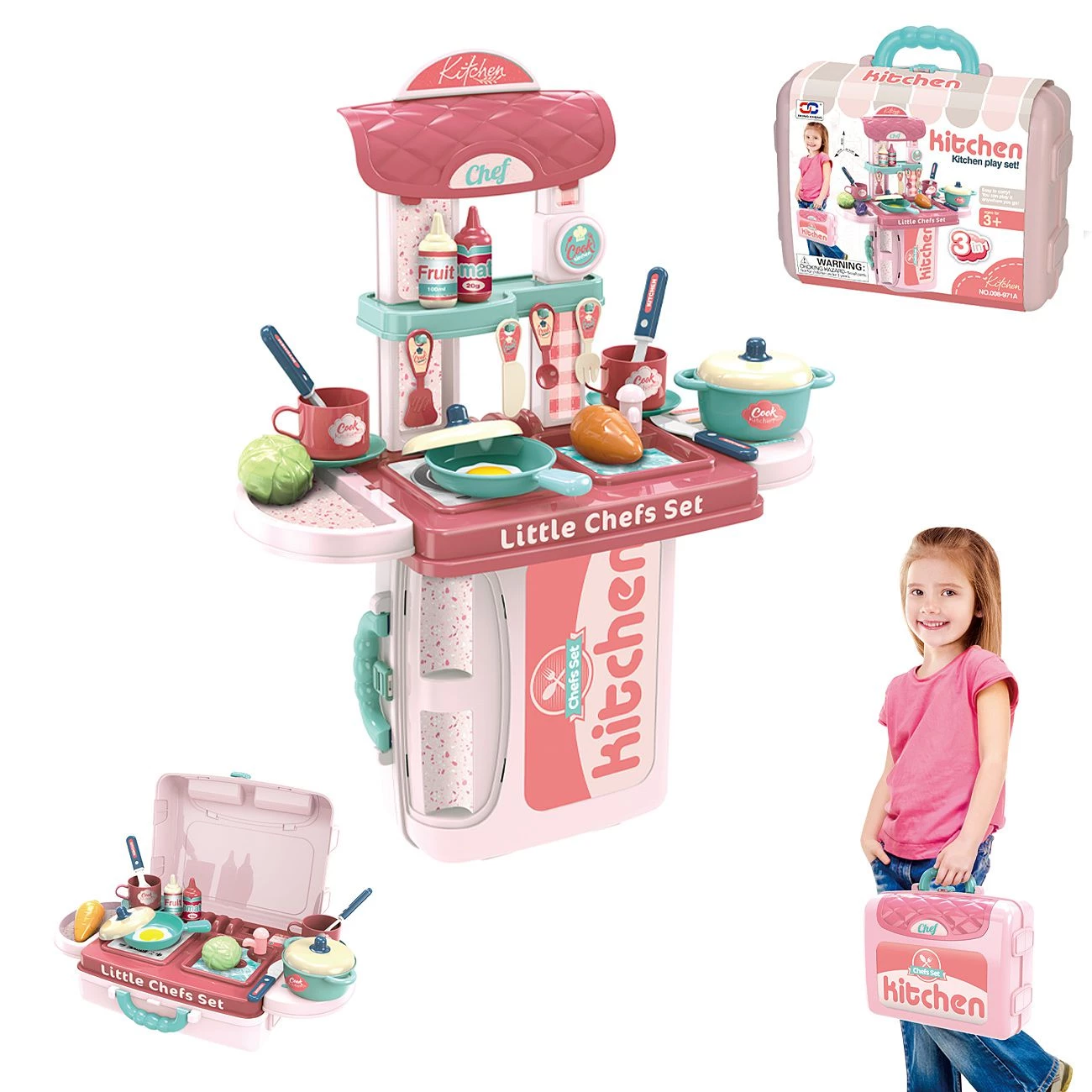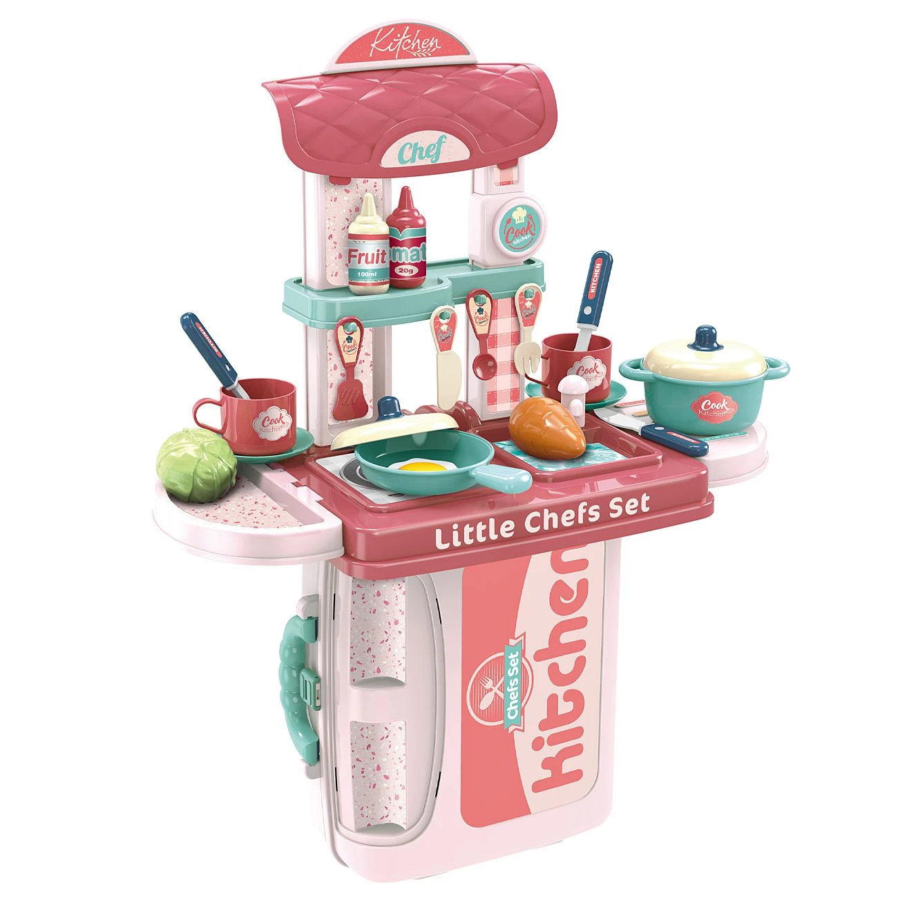 Praktična otroška kuhinja v kovčku, ki se hitro raztegne v razstavno kuhinjo in kuhinjo na stojalu z delovnim pultom. Kuhinja je opremljena z kuhalno ploščo, pipo, kljuke za obešanje kuh.pripomočkov, jedilni pribor in pripomočkov za kuhanje, ter različna živila. Material: trda kvalitetna plastika. Primerno za otroke od 3 let dalje.