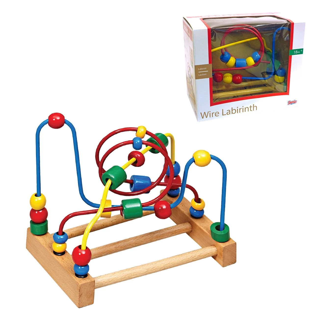 Leseni labirint. Otrok mora popeljati like od začetka do cilja. Spodbujanje motoričnih sposobnosti, spoznavanje barv in likov. Primerno za otroke +18 mesecev.