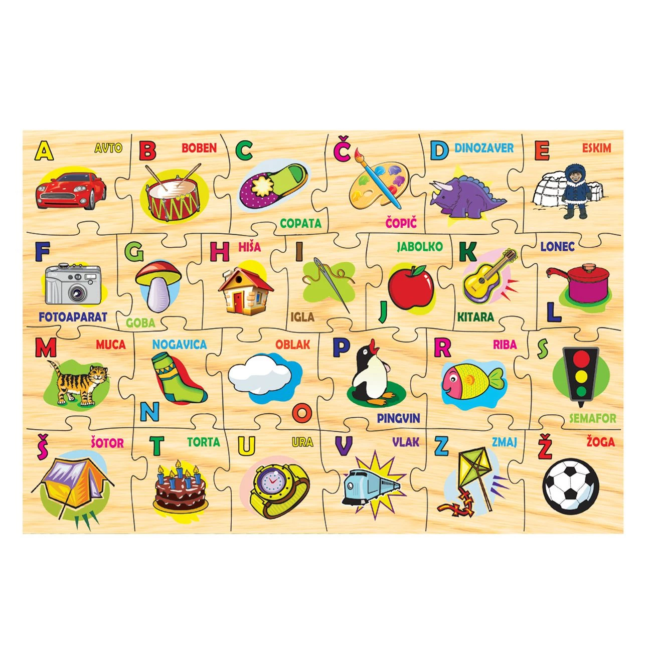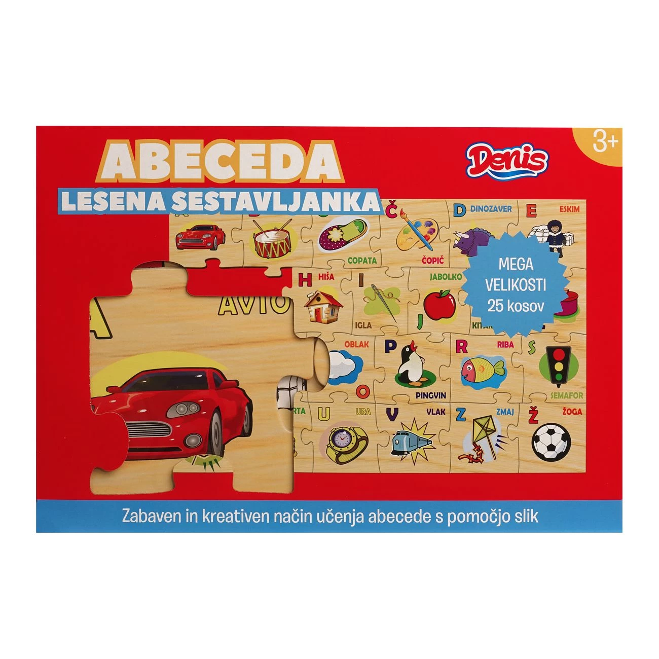 Lesena talna sestavljanka v slovenskem jeziku. Sestavljena je iz 25 delov s slikami in črkami v živih barvah. Otroci zlagajo sestavljanko in se učijo abecedo. Primerno za otroke od 3 let dalje.