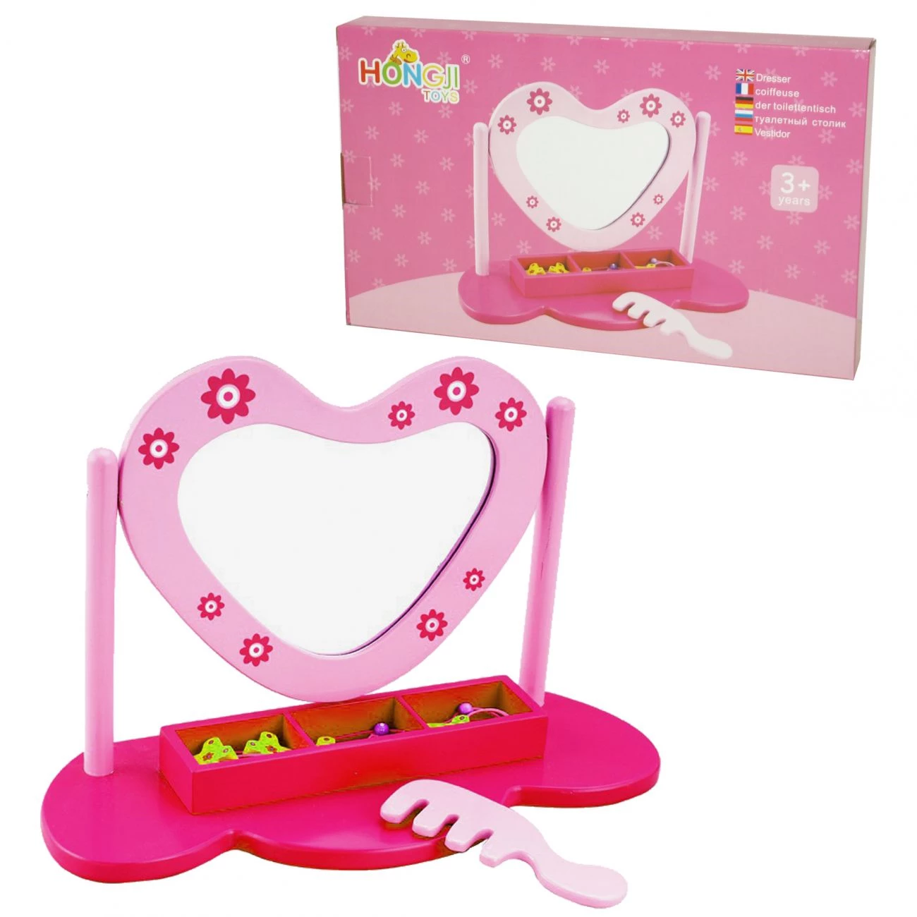 Leseno ogledalo, cca 21,0 x 34,5 x 43 cm. Polepšaj svojo sobo z lepim ogledalom, ki naj ti ga pomaga sestaviti starš, sama pa v predalčke spodaj pospravi svojo kozmetiko. Primerno za deklice +3 leta.