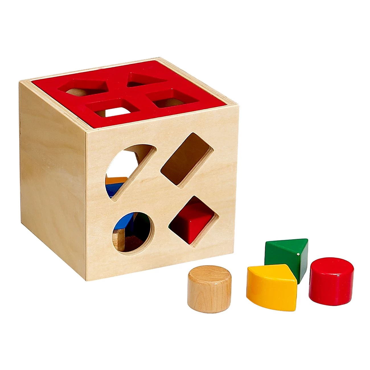 Lesena didaktična kocka. Vstaviti je potrebno različne oblike likov v prave odprtine. Otrok krepi didaktične sposobnosti, spoznava barve in različne like. Primerno za otroke +18 mesecev.
