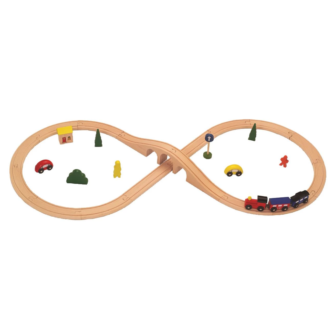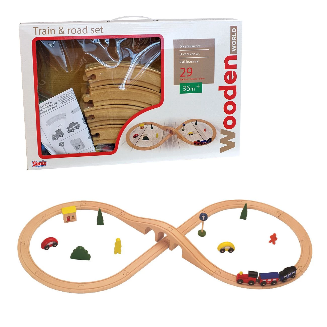 Lesena železnica iz 29 kosov. Sestavi železniško progo in postavi vlak, znake, avto, hišice. Igra se naj začne. Otroku pričara svet v malem. Primerno za otroke starejše od 3 let.