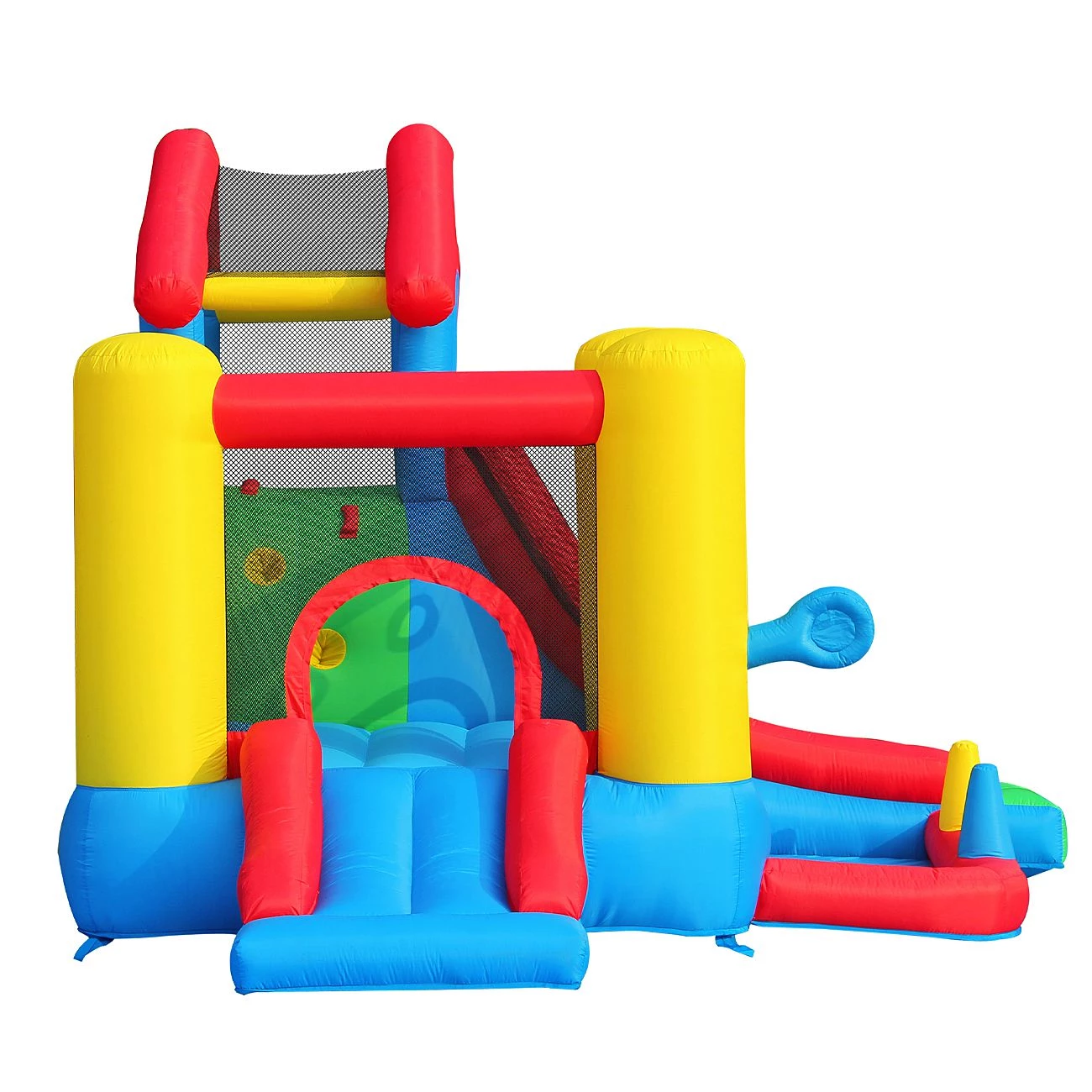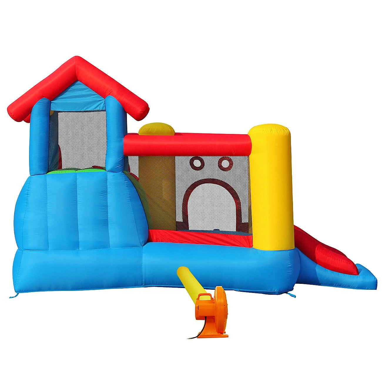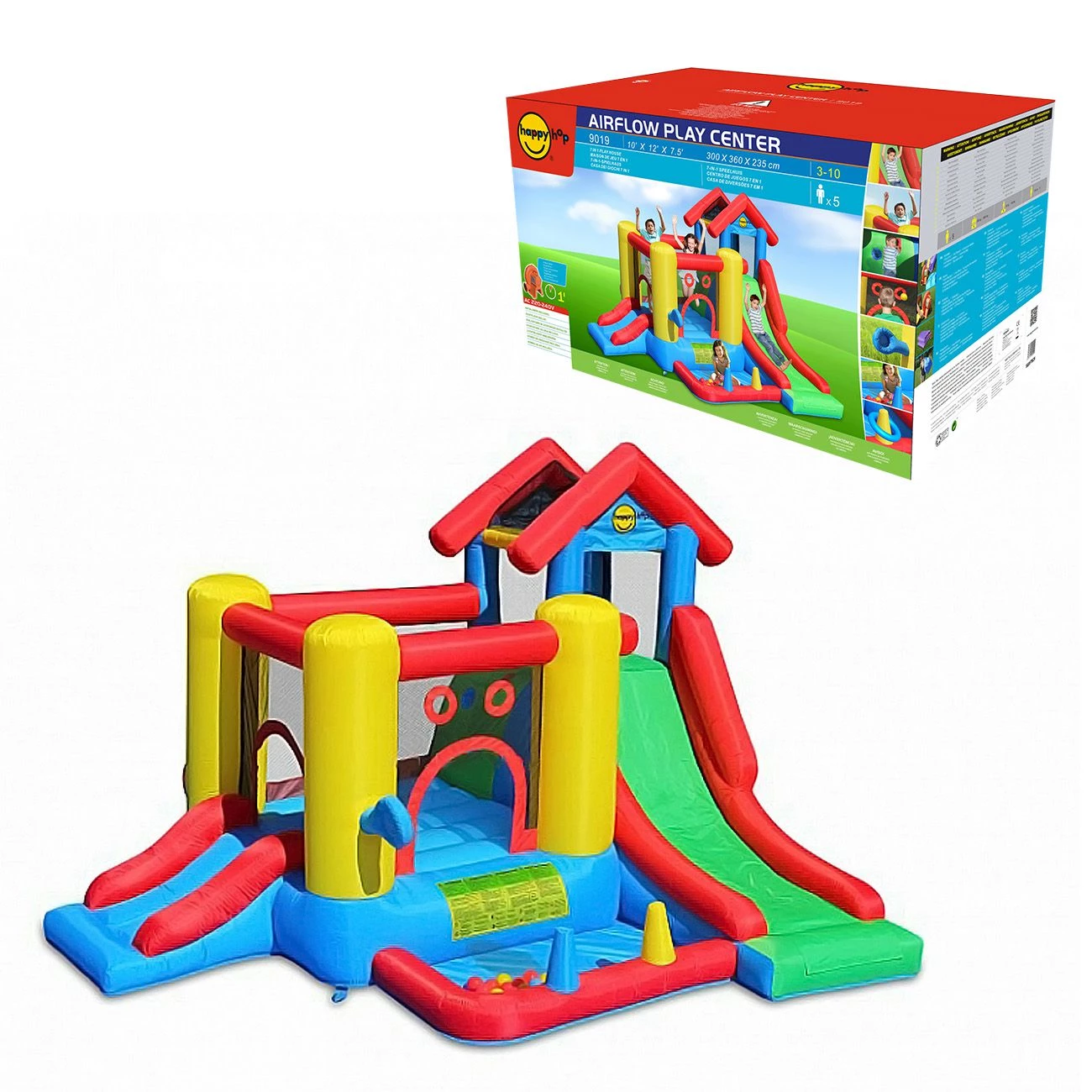 Napihljiva hišica, igralnica, skakalnica z dvema toboganoma bazenom in drugimi dodatki. Igralnica je za igro pripravljena v nekaj minutah, saj ima priloženo močan ventilator Po igri se ventilator enostavno izklopi in igralo se samo sprazni. Velikost 300 cm x 360 cm x 235 cm. Primerno za največ 5 otrok skupne teže 130kg starosti od 3 let dalje in višine od 90 cm do 150 cm. V kompletu ventilator, klini, igralo, set za popravilo, vreča za shranjevanje, navodila.