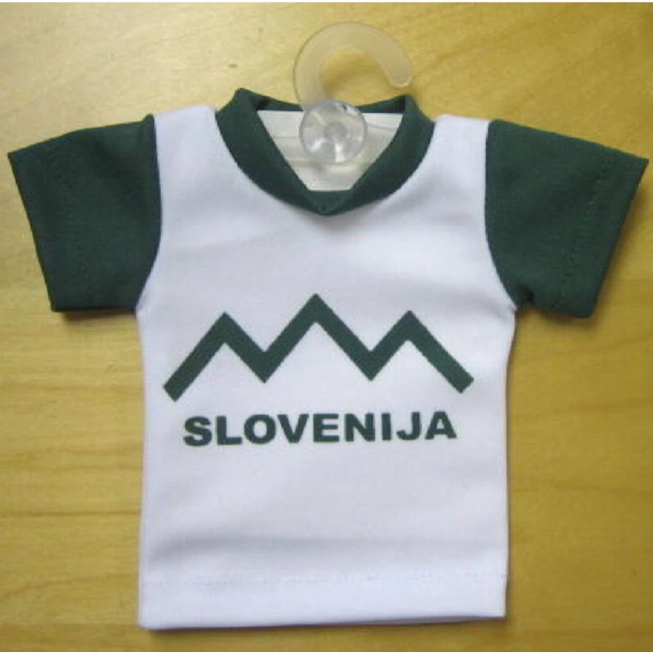 Poliesterska majčka, velikosti 10x15 cm, z napisom Slovenija in številko 10 na hrbtni strani, obešena na obešalnik z vakumom.