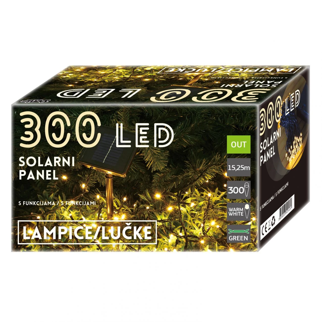 300 LED lučk, 8 funkcij. Topla bela barva. Lučke v razmiku 5 cm, na zeleni žici. Dela na baterije (3V) s SOLARNIM polnjenjem. Lučke svetijo cca 6 ur. Za zunanjo in notranjo uporabo.