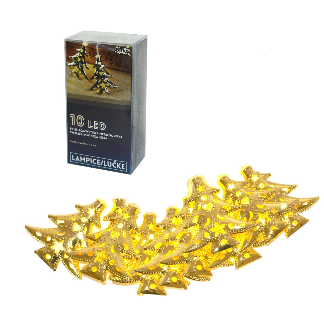 10 kovinskih smrečic, velikosti 6 cm, krasi topla bela LED svetloba. Nanizane so na prozorni kabel v razmaku 15 cm. Delovanje na baterije. (Potrebujete 3 baterije tipa AA, ki niso priložene.) Namenjeno za notranjo uporabo.