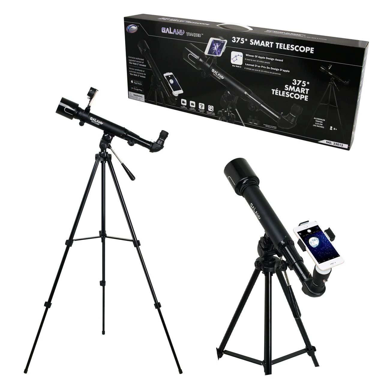 Pravi astronomski teleskop 375, z aluminjastim trinožnim stojalom. Uporabi svoj pametni telefon in ga pritrdi na teleskop. Telefon te bo, s posebno aplikacijo popeljal do kateregakoli ozvezdja boš želel. Premer objektiva 50 mm. Vsebuje teleskop, trinožno stojalo 115 cm, držalo pametnega telefona (telefon ni vključen), 3 x leča, ogledalo in navodila