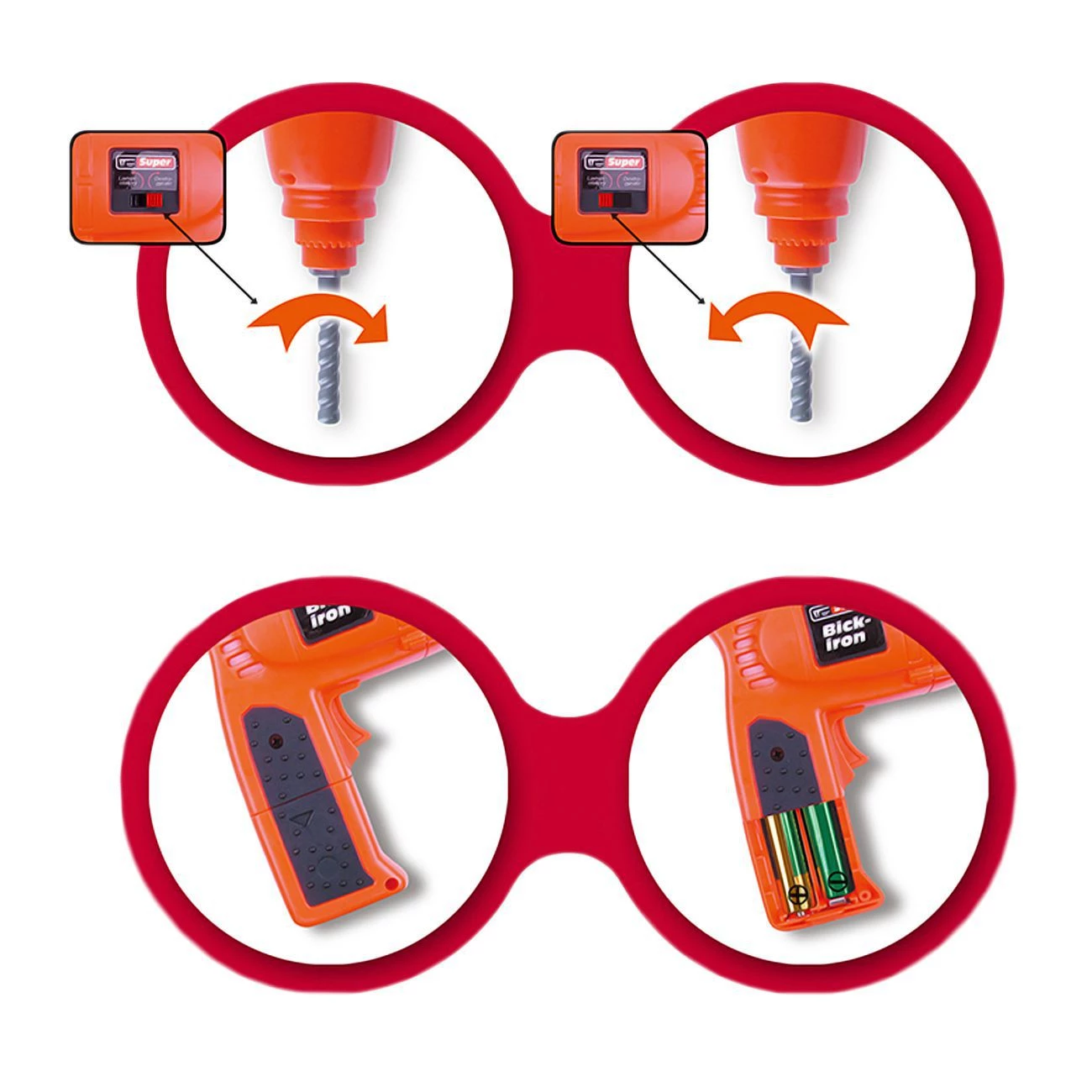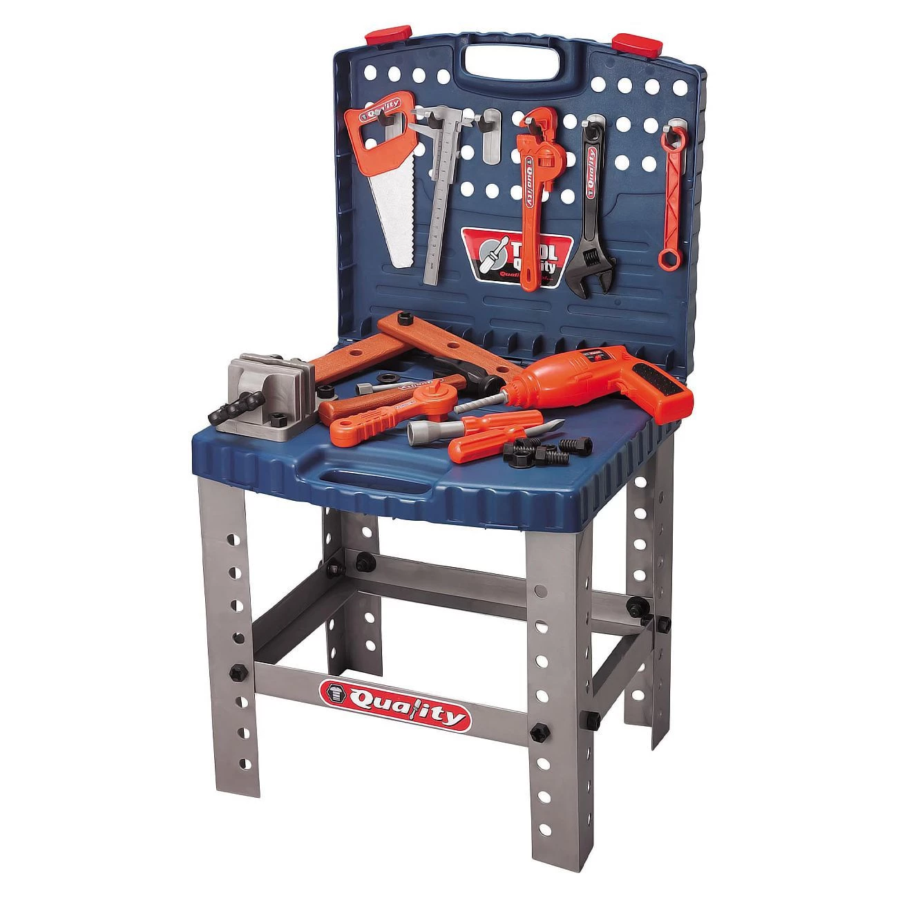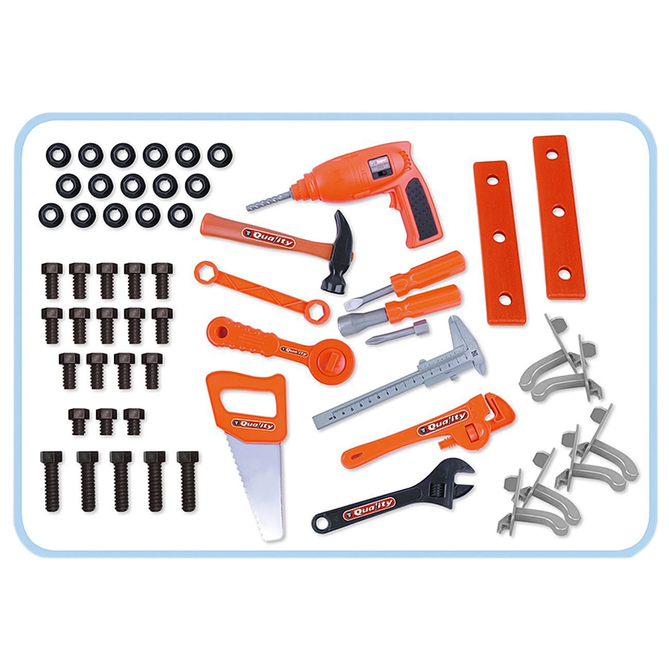 Postani pravi mojster za popravila na domu za to na pot vzemi svojo mobilno delavnico. Kovček velikosti: 40 x 35, se hitro sestavi v delovno mizo za male in velike mojstre. Set vsebuje: orodje, matice, vikaje, podložke.... Za vrtalnik potrebujete 2 x AA baterije, ki niso priložene. Primerno za otroke od 3 leta dalje.